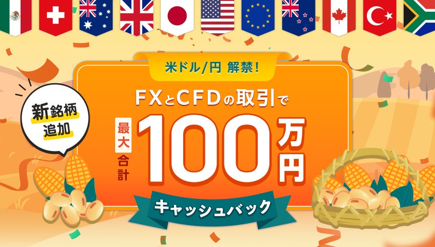 現在、FXネオ「米ドル/円」を含む全銘柄の取引数量、CFD「コーン」「大豆」の取引数量に応じて、各取引最大50万円、合計最大100万円をキャッシュバックする「【米ドル/円解禁】FXとCFDの取引で最大合計100万円キャッシュバック!秋の収穫キャンペーン!」を開催中です。