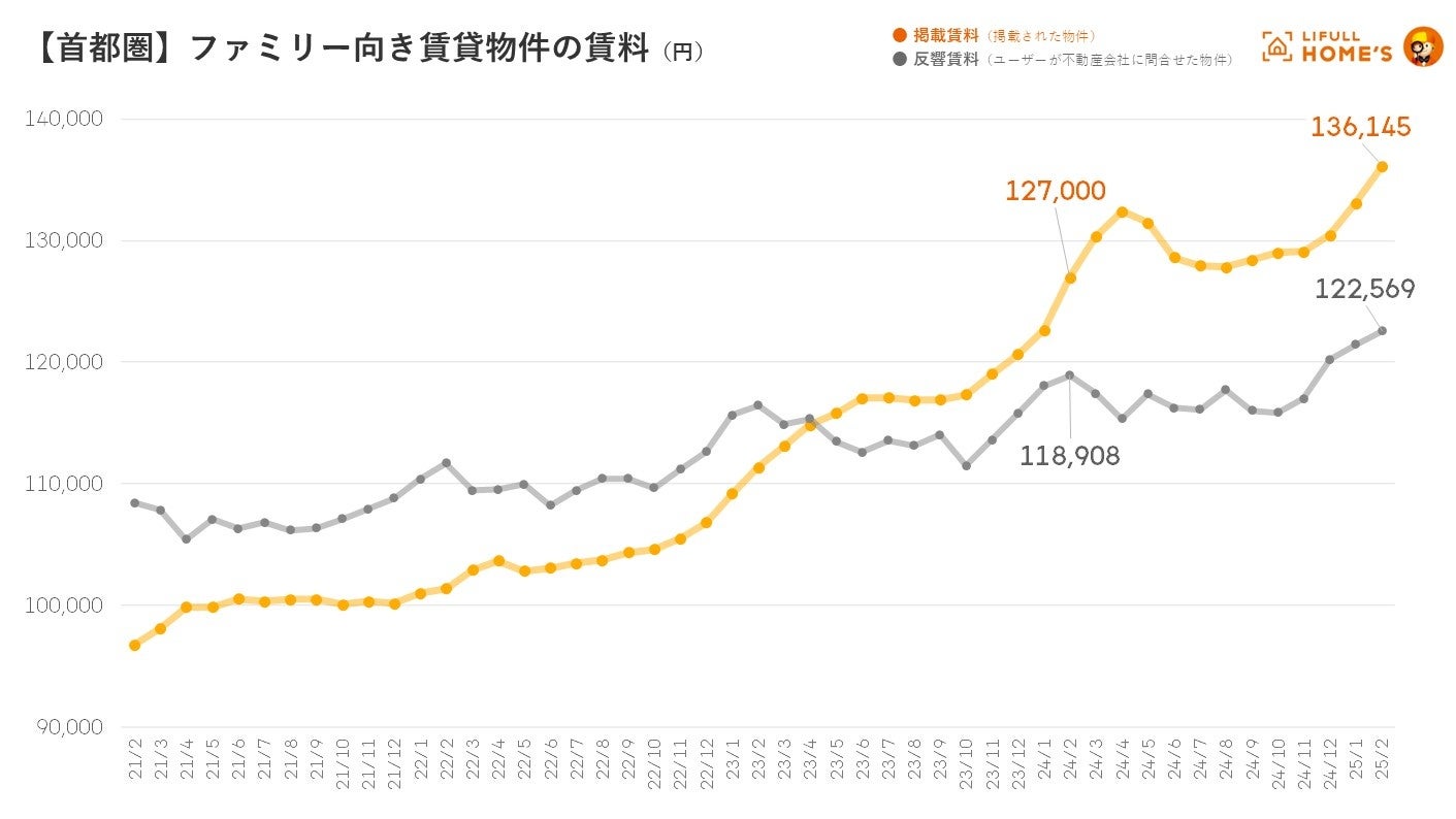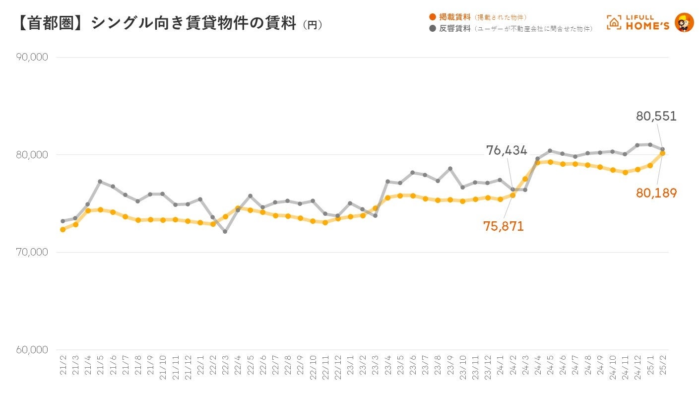 首都圏(東京都、神奈川県、埼玉県、千葉県)の掲載物件平均賃料は、シングル向き物件が80,189円、ファミリー向き物件が136,145円で、ともに2ヶ月連続で過去最高*1賃料を更新しました。
