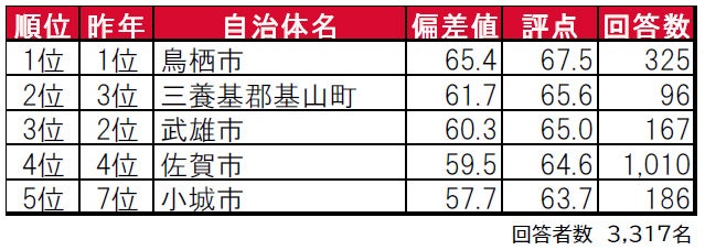 TOP2は昨年に引き続き、1位福岡県福岡市、2位佐賀県佐賀市です。昨年は九州・沖縄の自治体のみを対象として集計していましたが、今年は全国の自治体を対象とした結果、3位には東京23区がランクインしています。5位は福岡県糸島市で、TOP5のうち3自治体は佐賀県以外の自治体という結果になっています。