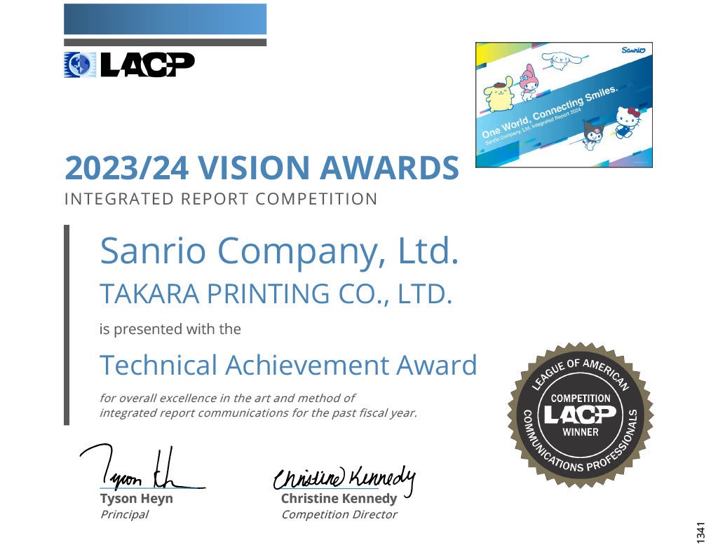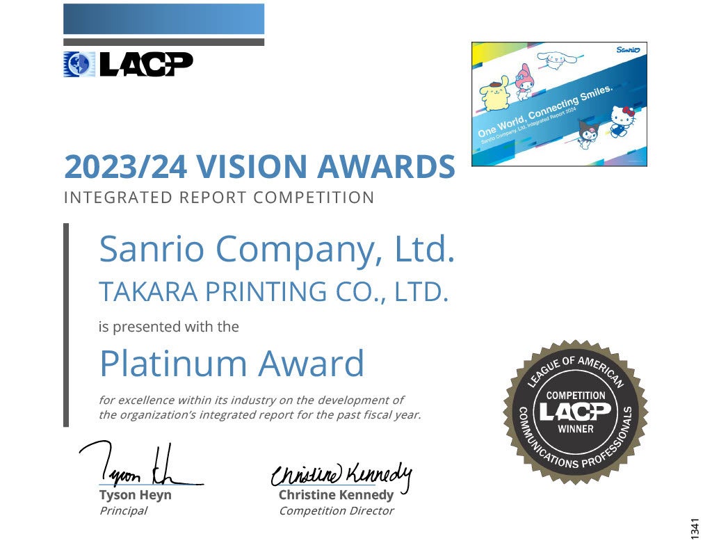 株式会社サンリオ(本社:東京都品川区、社長:辻󠄀 朋邦、以下サンリオ)は、米国の2大レポートコンペティションの1つである「2023/24 Vision Awards」の統合報告書部門において、「株式会社サンリオ 統合報告書2024」が世界ランキング1位を獲得いたしました。