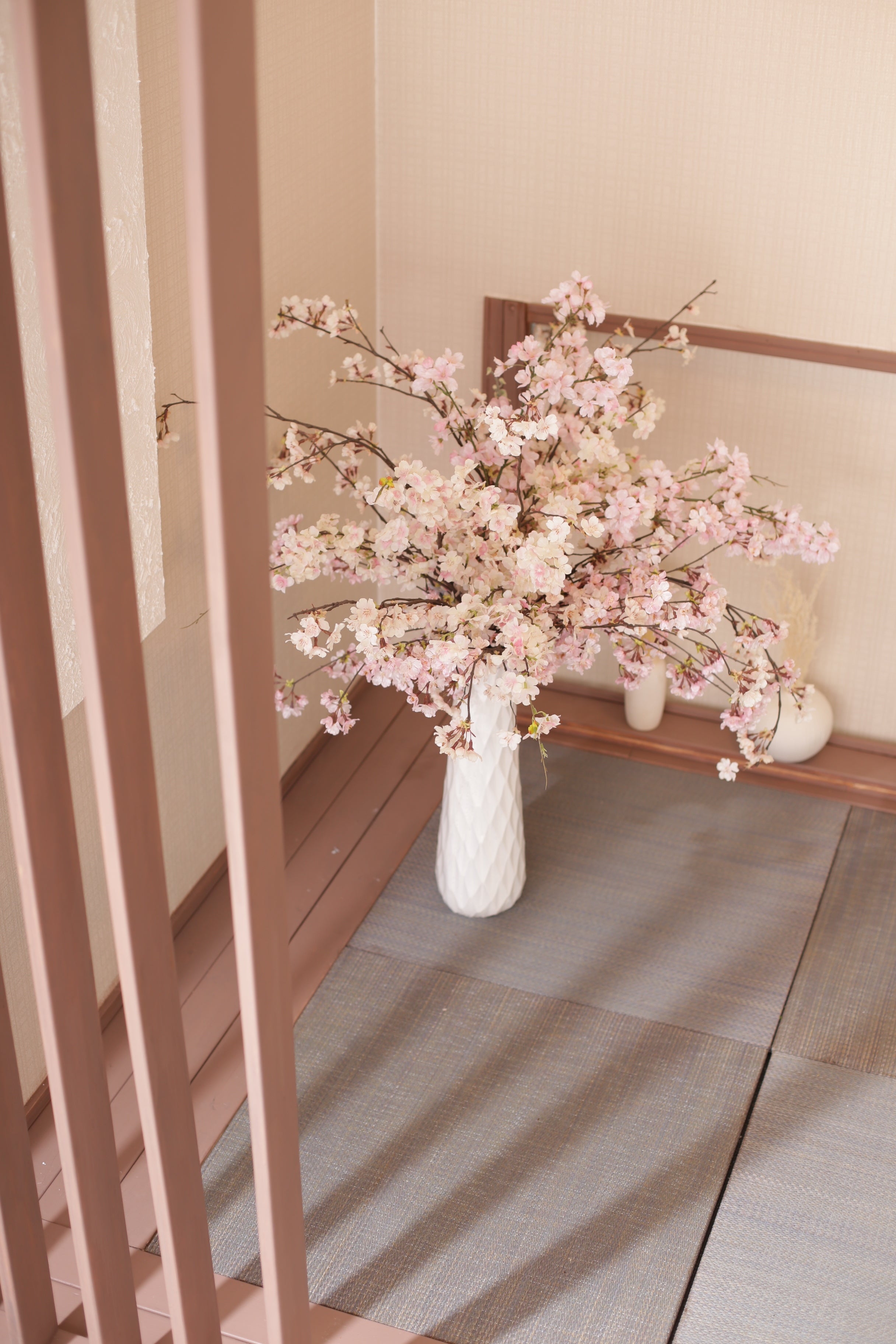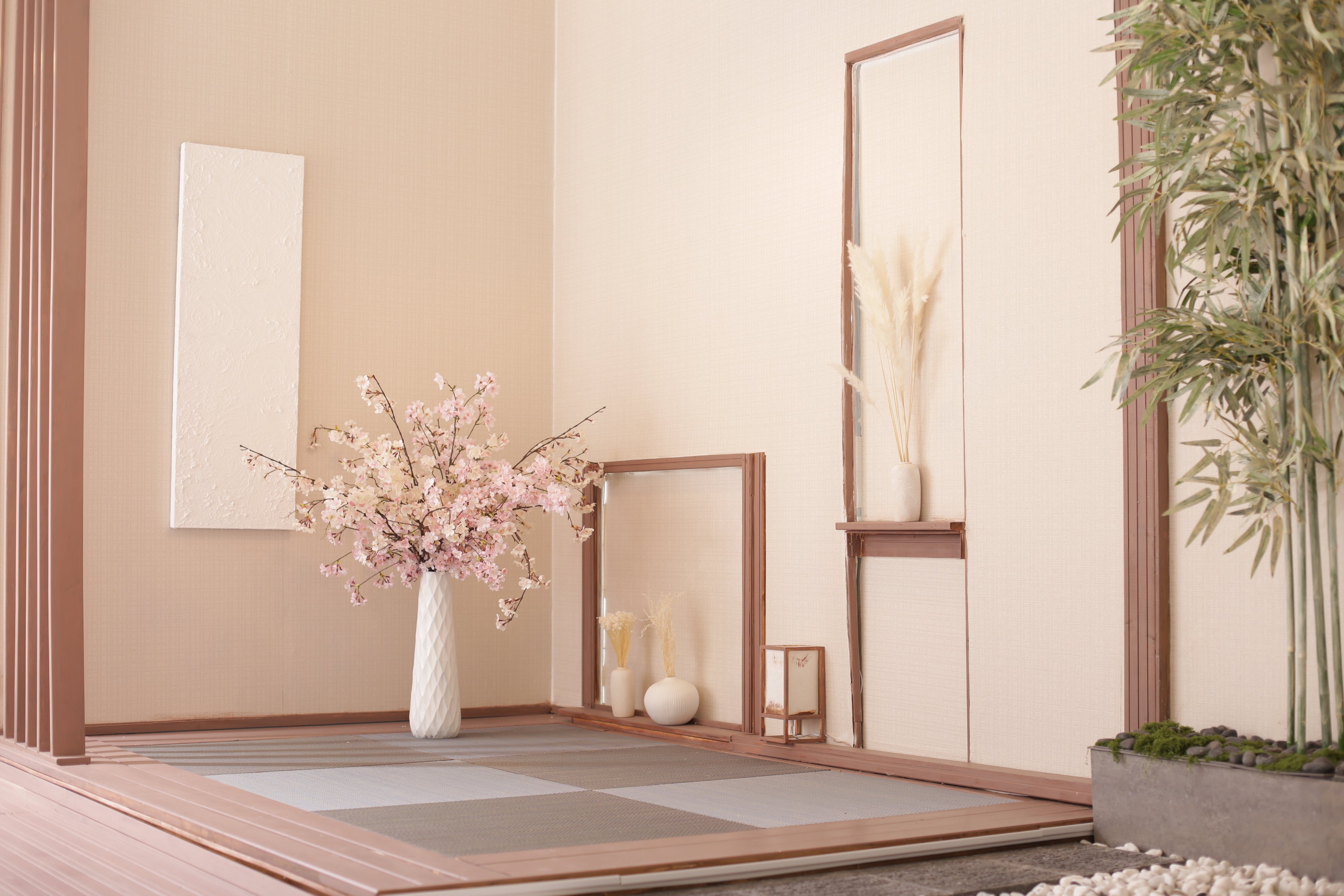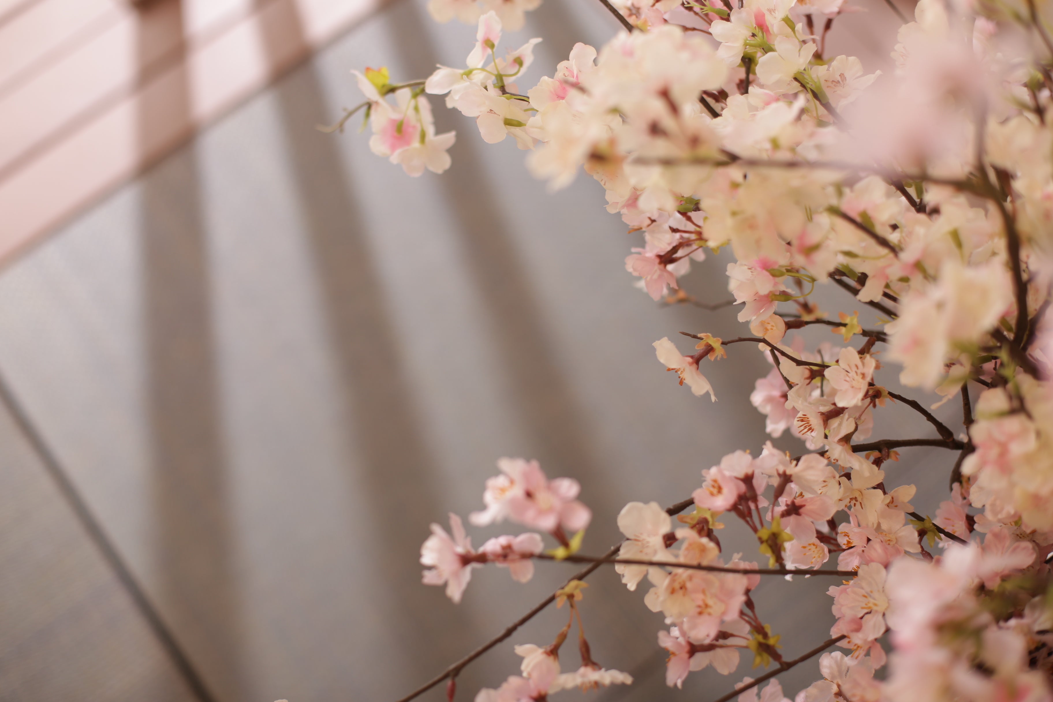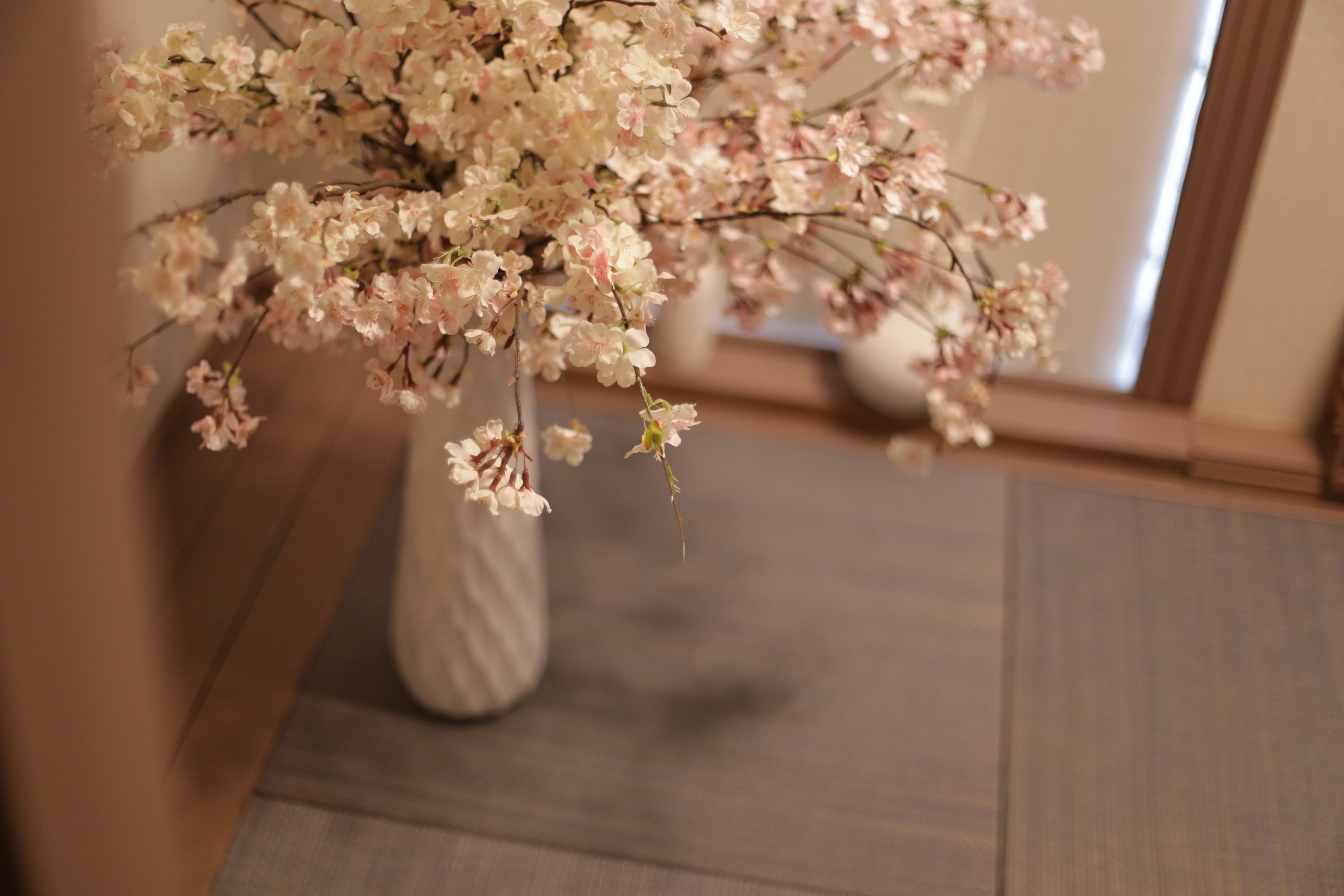 モダンな色味で畳が引き詰められ、満開に咲いた桜がある、庭園からの朝の和室。