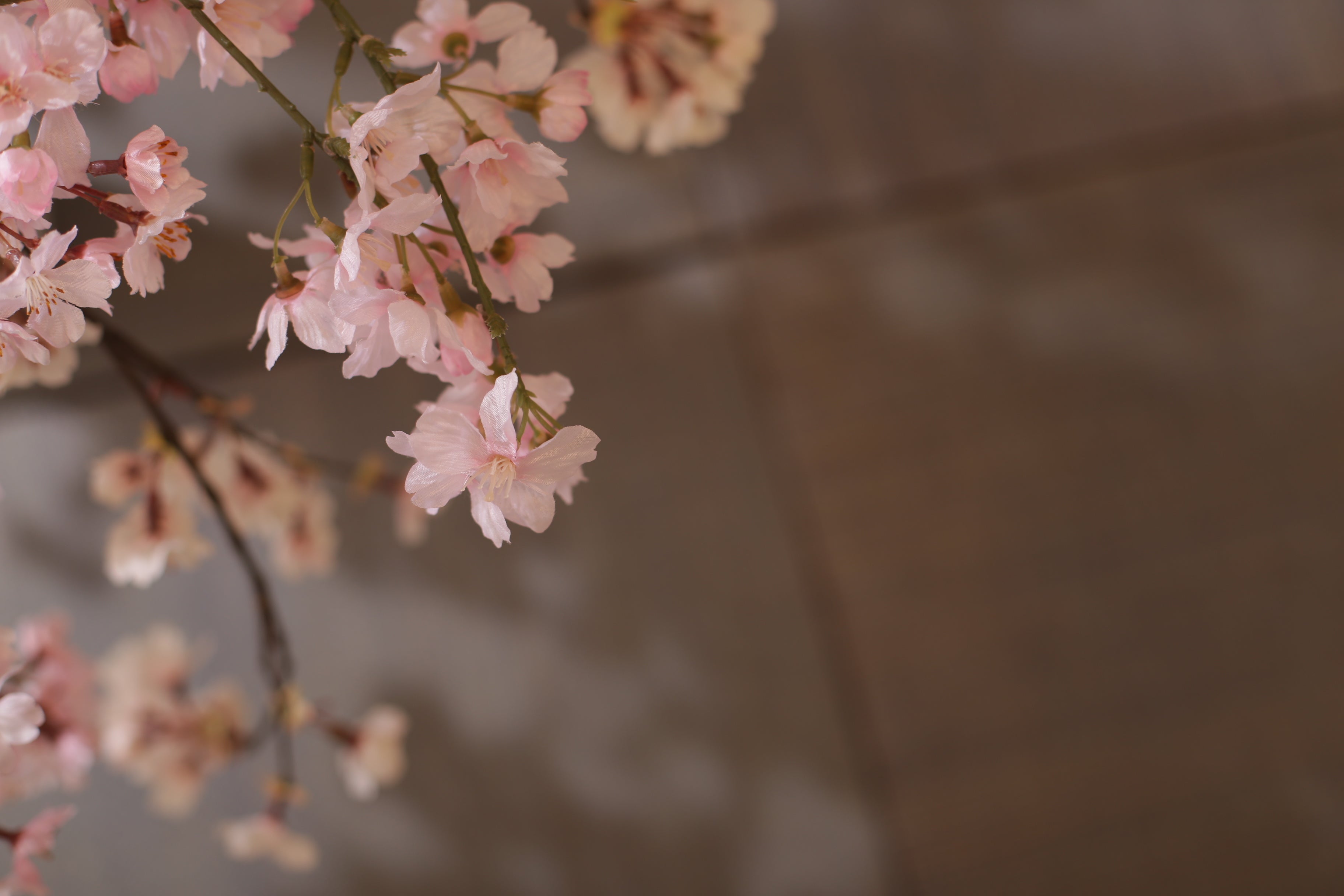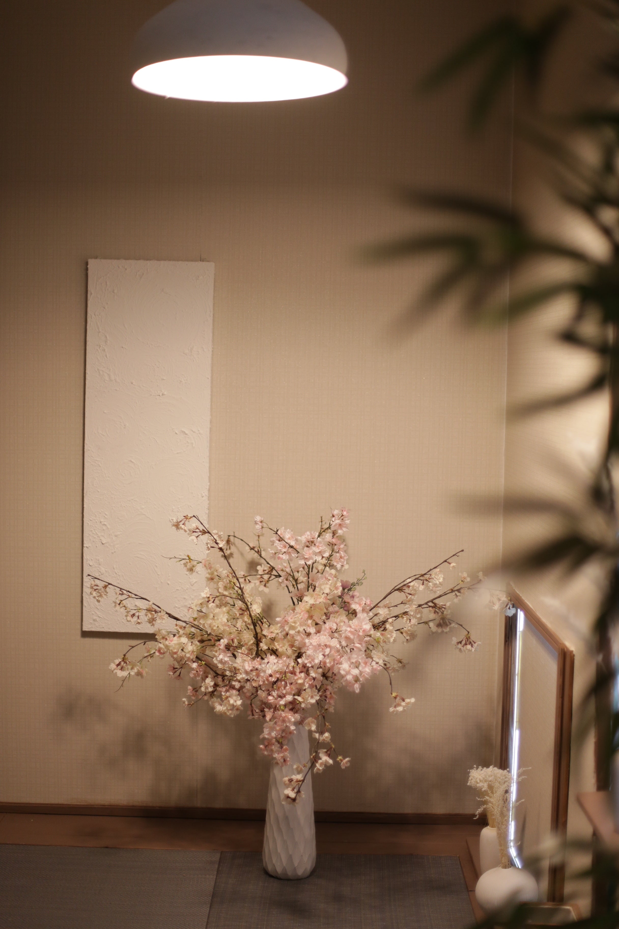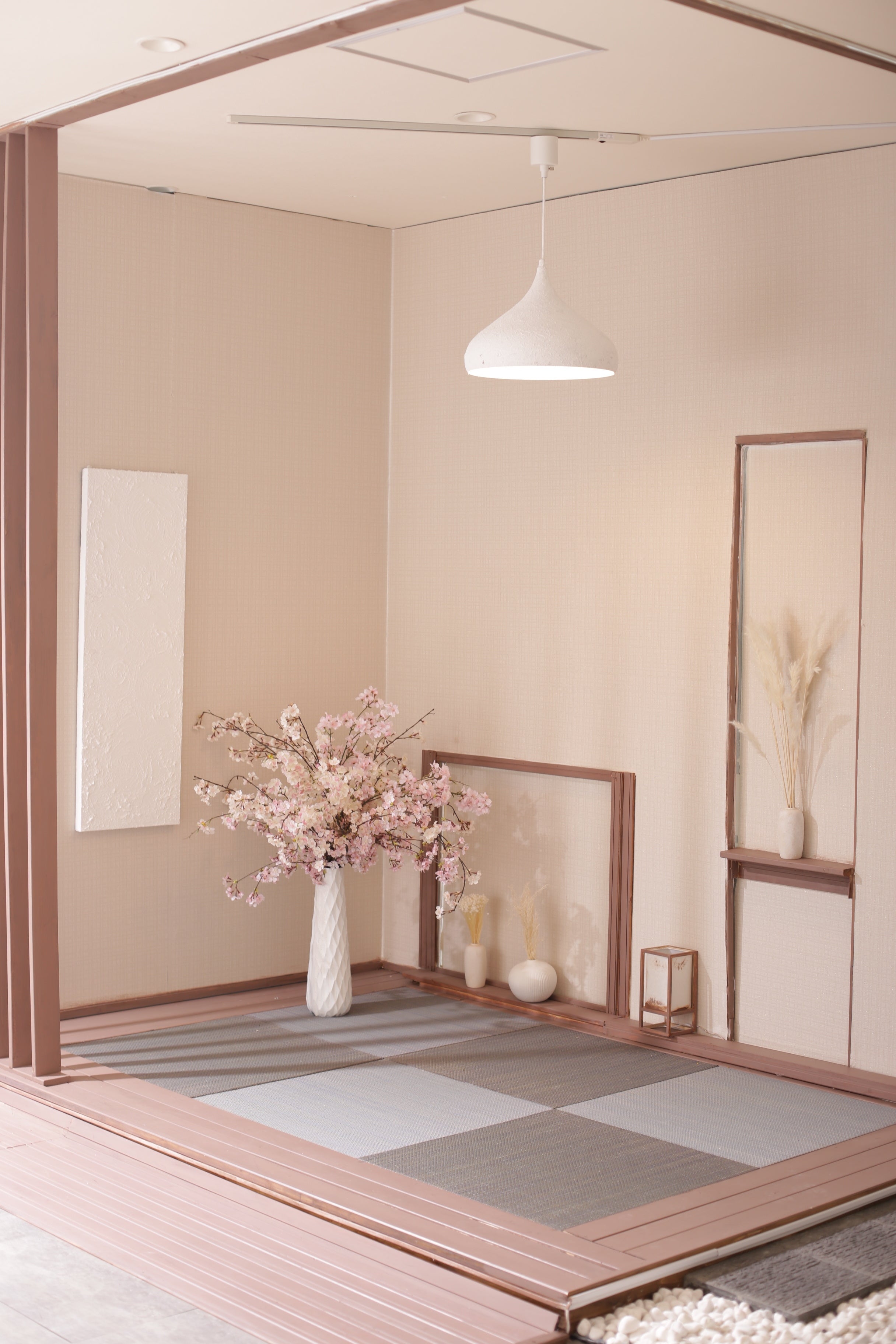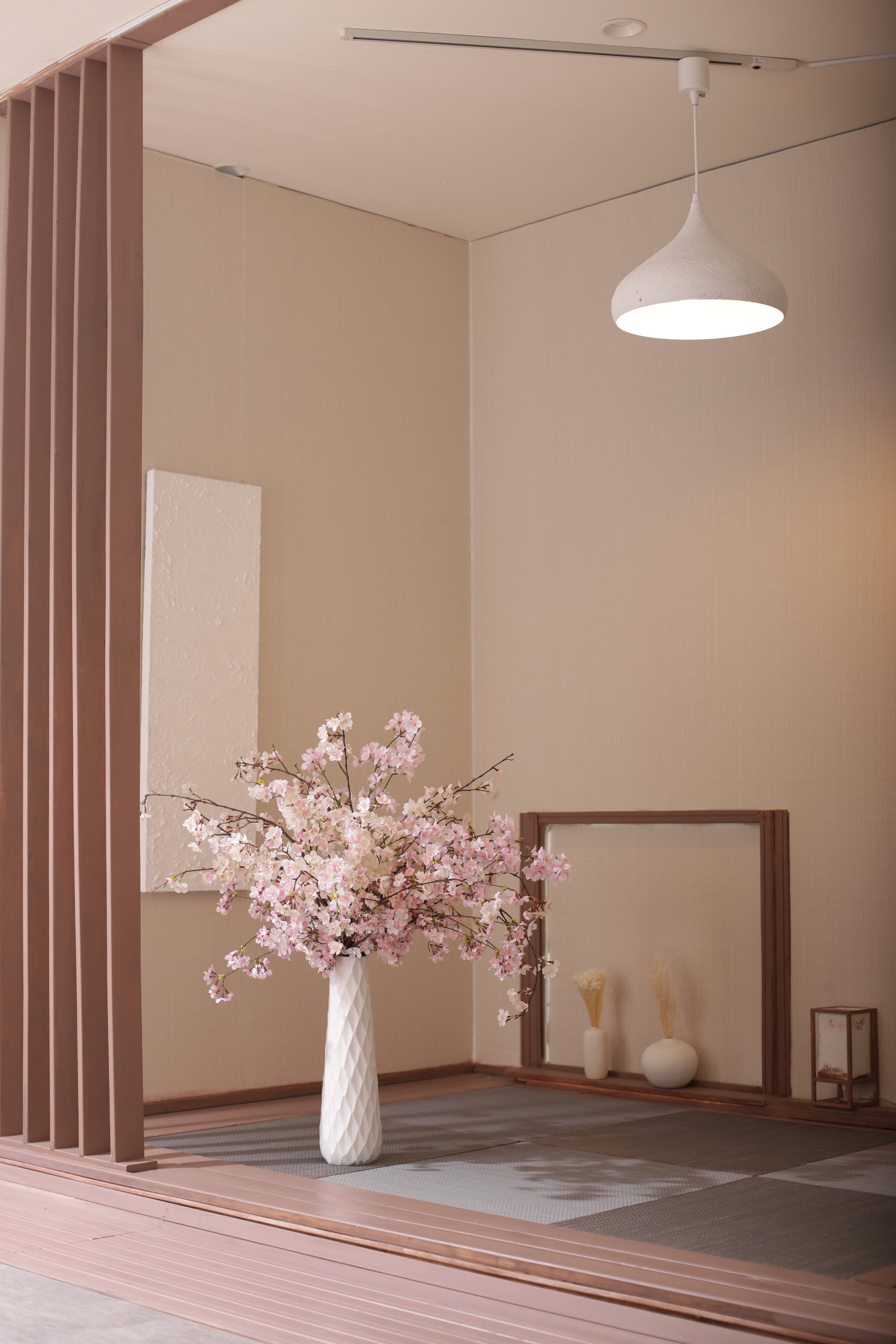 モダンな色味で畳が引き詰められ、満開に咲いた桜がある、庭園からの朝の和室。