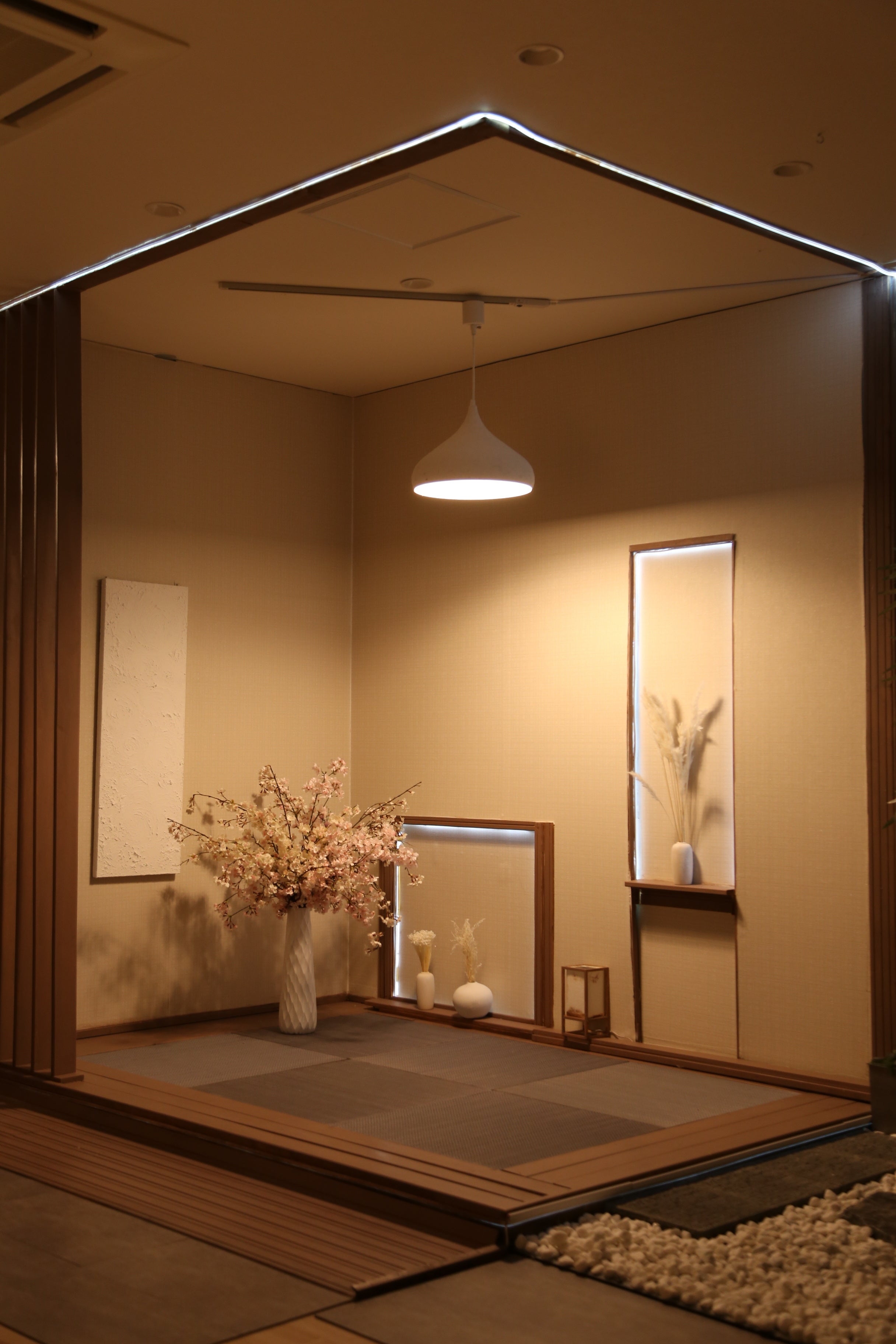 ぱれっと函館店の和室は朝の日差し感、日が落ちた夜は光を灯す二面性がある、今まで見たことのない新感覚の和室です。