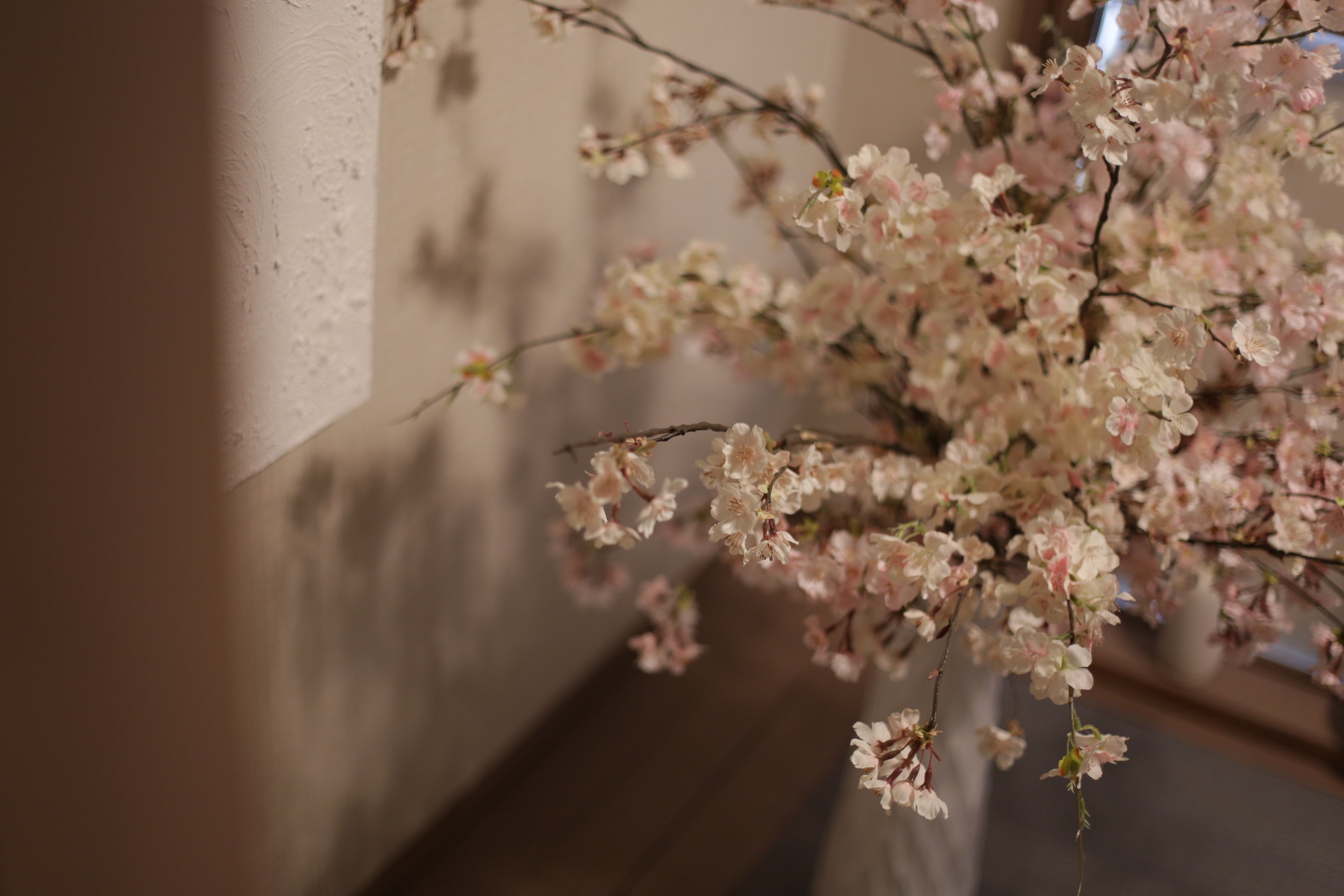 中庭にある竹ごしの桜の影が落ち着いた雰囲気を作ります。