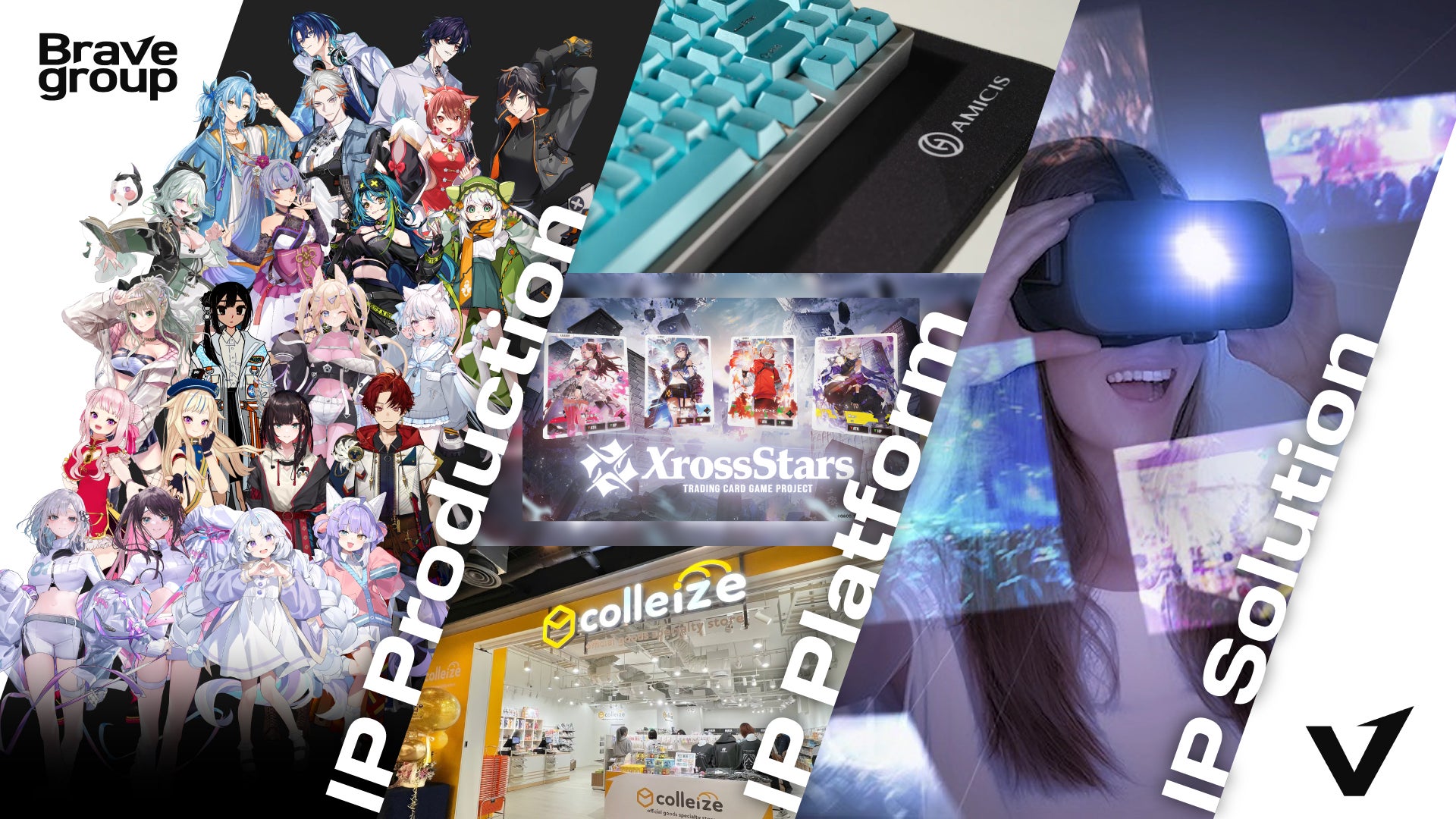 Brave groupは『世界に、日本の冒険心を』というパーパスを掲げ、『80億の、心をうちぬけ』というミッションのもと、VTuber事業を中心に展開するIP Production領域をはじめ、周辺のIP PlatformやIP Solution領域を通じて、自社IPのみならず他社IPと連携して国内外にIPを多角的に展開しています。当社は、国内外におけるIP創出のみならず、ファンとクリエイターをつなぐ新しい事業展開をIPとテクノロジーの融合によって、世界80億人の心を動かす次世代のエンターテインメントを創出しております。
