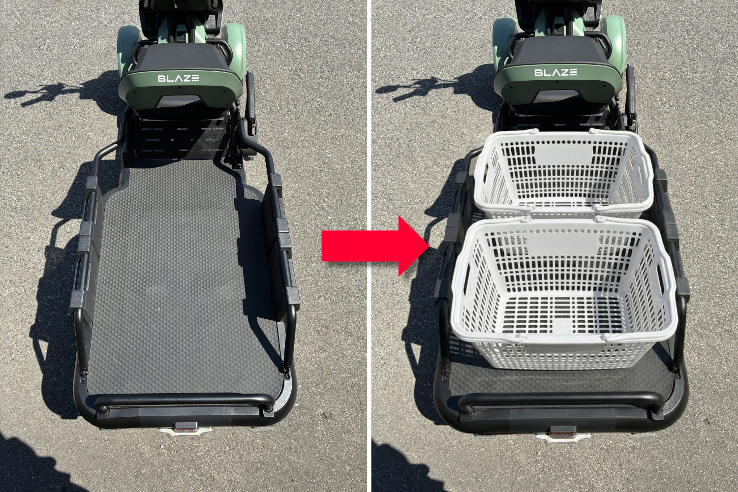 当社初となる4輪モデルの特定小型原付 「BLAZE e-CARGO(ブレイズ イーカーゴ)」 は、4輪構造による高い安定性に加え、日常使いから業務利用まで対応できる実用性を備えています。最大30kgまで積載可能な荷台を搭載しており、近所の買い物や小口荷物の運搬など、さまざまなシーンで安心して使用できます。