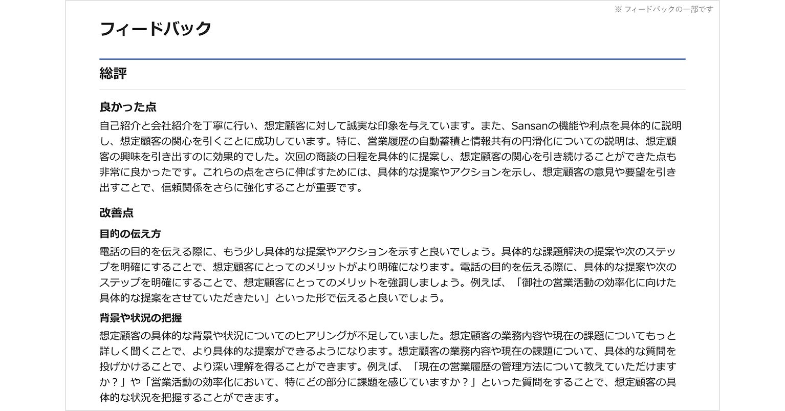 演習の最後には、会話を通してユーザーが商談相手との信頼関係構築から提案までをどのように行えたかといったまとめや全体を通して「良かった点」「改善点」「獲得した商談ですべきこと」などが細かくフィードバックされます。また、AIが顧客役として設定した人物像の「名前」「年齢」「性別」「部署・役職名」「性格」「業務上での悩み」「直近・中長期での課題」なども開示されるほか、過去に実施したロールプレイングの内容も確認できるため、効果的な振り返りに活用できます。