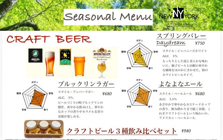 【目黒区学芸大学・自由が丘】初夏のスペシャルメニューが登場。クラフトビール3種飲み比べセット|ニューヨークキッチンARAI碑文谷店