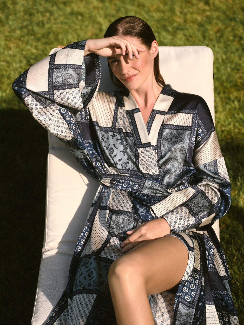 キモノガウン:ハンマーサテンシルクを用いたパッチワークプリントの一着。ブルーを基調にしたトーンに、さりげないコラボモノグラムを重ね、共布ベルトでウエストをマーク。