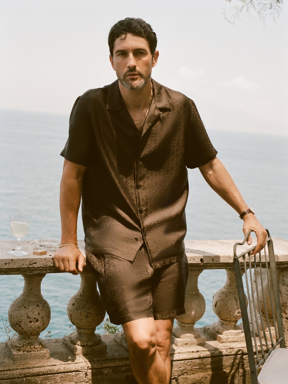 クロスオーバーシャツ & モノグラムパンツ:キュプラ素材に、両ブランドのモノグラムをトーナルカラーで全体に配したサマーセットアップ。