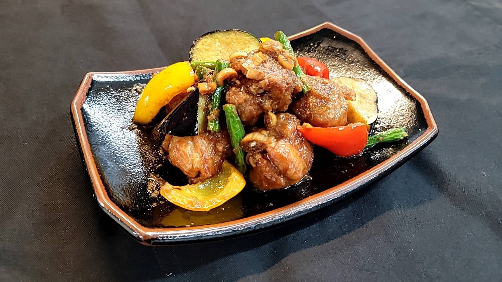 茄子、パプリカ、インゲンなどの夏野菜を使用した彩豊かな黒酢の油淋鶏です。暑い夏でもさっぱりとお召し上がりいただけます。