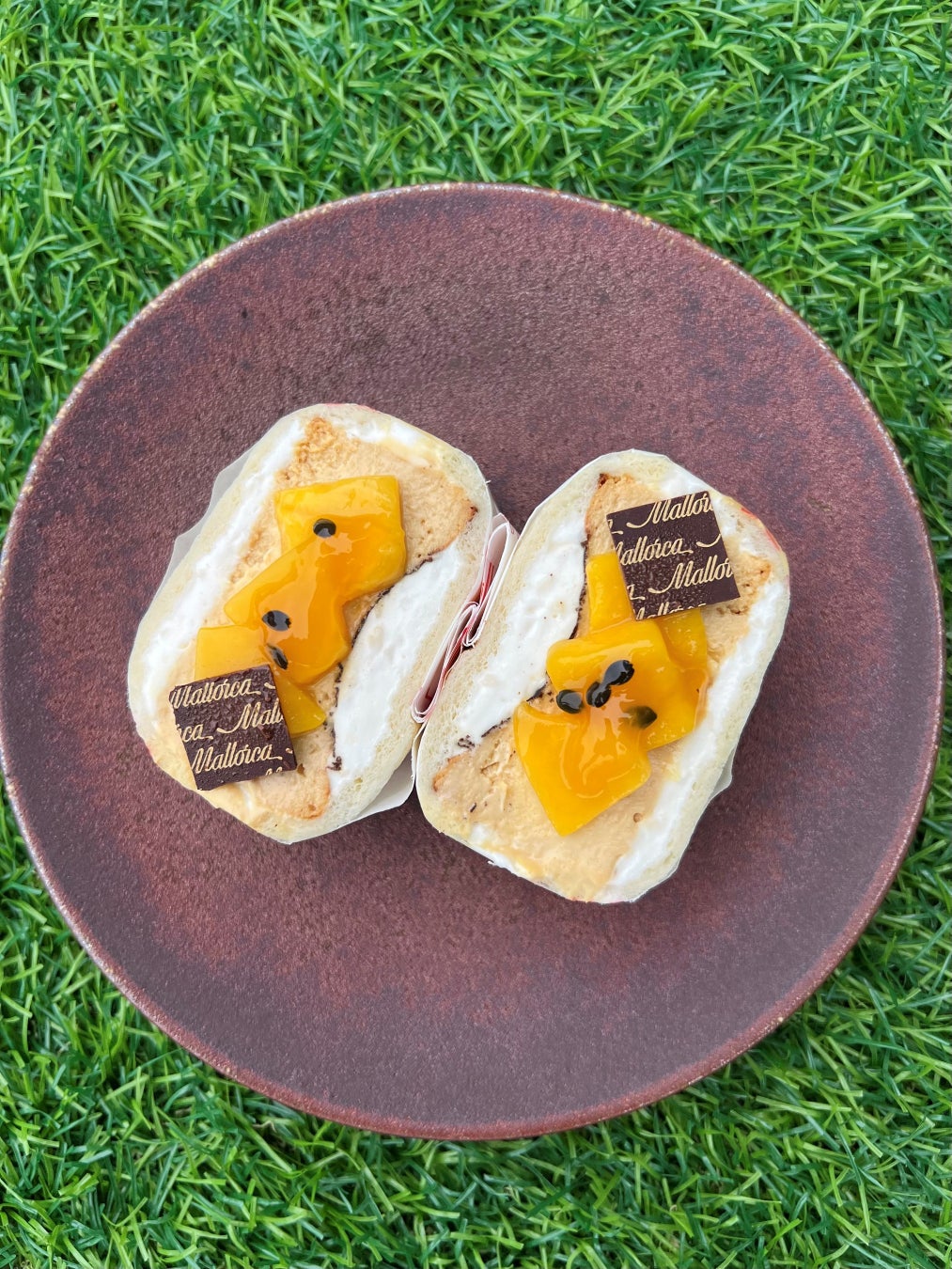 ほろ苦いキャラメルのバスクチーズケーキに、甘酸っぱいマンゴーとパッションフルーツ、アクセントにココナッツクリームをたっぷり絞った、この時期だけのスイーツサンドです。