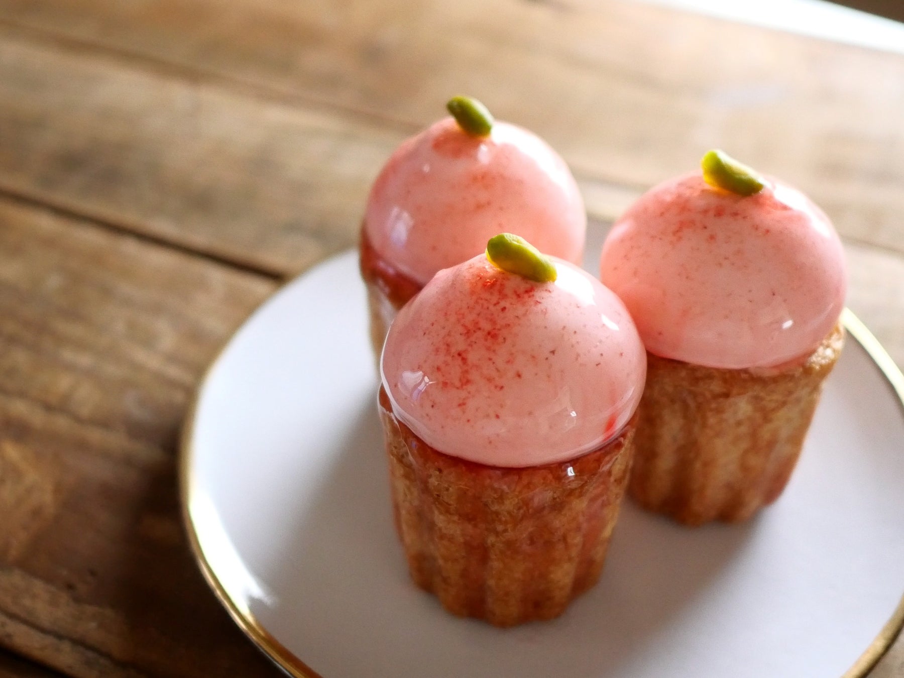 カヌレの形をしたシュー生地に桃風味のクリームを詰め、桃に見立てた白桃のムースを上に乗せました。爽やかで可愛らしい夏の一品です。
