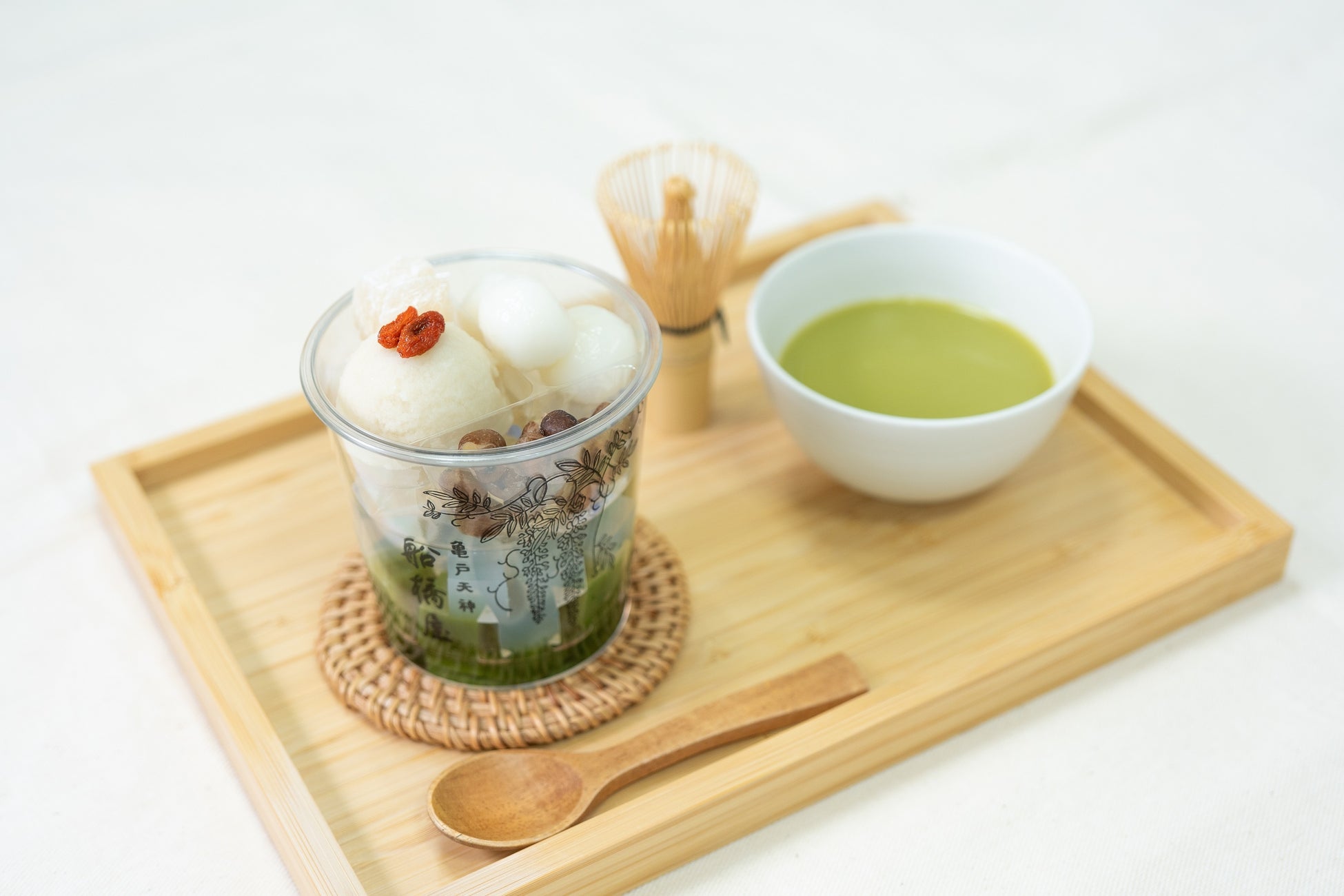 風味豊かな抹茶寒天とミルク餡を乗せた限定あんみつです。人気の白玉を添えて白蜜でお召し上がり下さい。