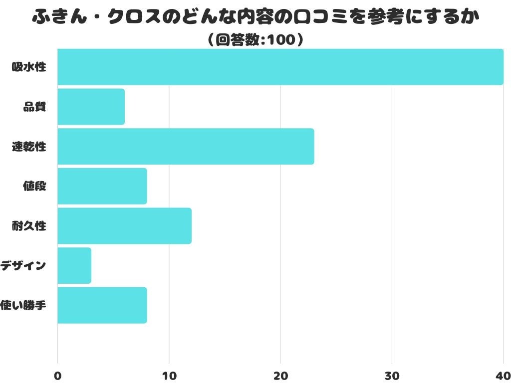 ふきん・クロスのどんな内容の口コミを参考にするかをアンケートにて調査したところ、1位は「吸水性」でした。