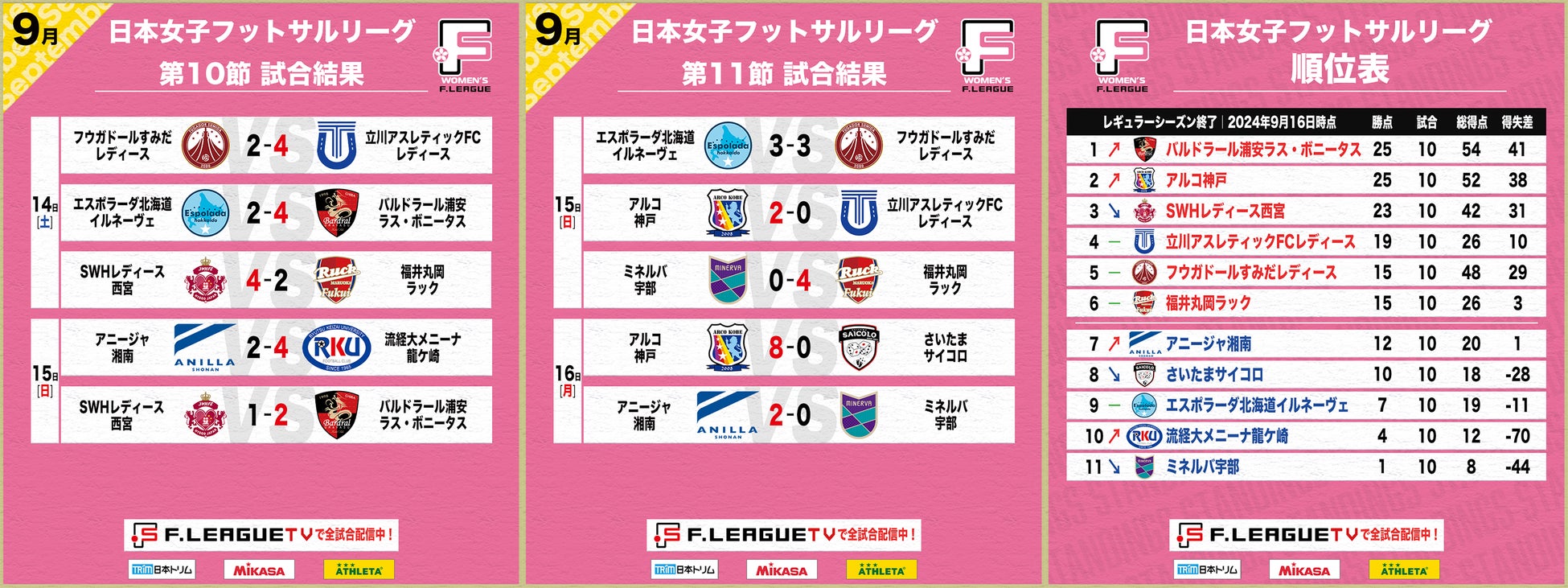 9月14日(土)〜16日(月)の3日間で実施された女子Fリーグ2024-2025 第10節・第11節の5試合について結果をお知らせいたします。