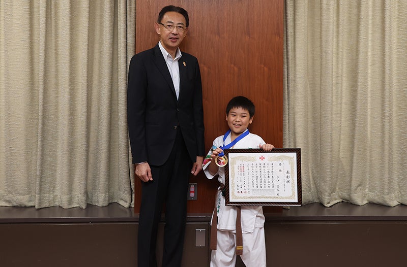高槻市立柳川小学校3年生の谷口翠春さんが令和7年5月16日(金曜日)、高槻市役所を訪問し、2月に福岡県で開催された「第4回極真手塚杯世界空手道選手権大会」小学2年男子の部門で優勝したことを濱田剛史市長に報告しました。