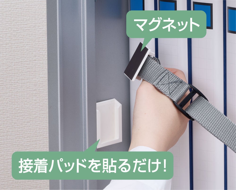 また、同日発売の「収納棚につける落下防止ベルトN」はスチール棚に取り付けることで、棚に収納している書類や保管物の落下を防止します。今回のリニューアルでスライド式着脱を採用し、収納物の出し入れがより簡単になりました。