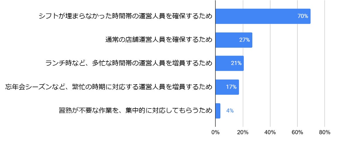 「シフトが埋まらなかった時間帯の運営人員を確保するため」が7割と最も高く、常勤スタッフでは不足する部分を、スポットワークで担保している現状が明らかとなりました。