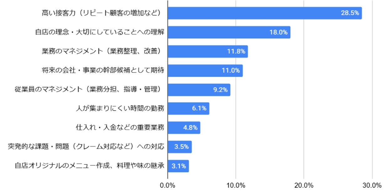 最後に、常勤の社員・アルバイトにしかできないこと・期待することを聞きました(N=228)。最も多かったのは、約7割が回答した「高い接客力」で、次点は約半数が回答している「自店の理念・大切にしていることへの理解」「業務のマネジメント」と続く結果になりました。いずれも長く勤務することにより培われる能力が選ばれています。