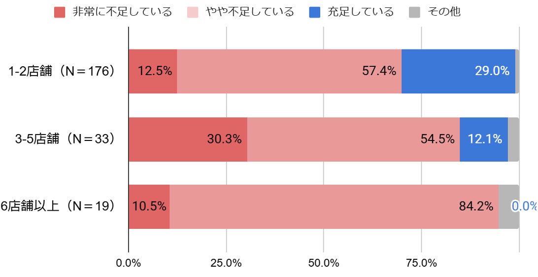 まず、現在の人材充足の状況について聞いたところ、どの店舗数規模でも大きく変わらず不足しているという結果になりました。