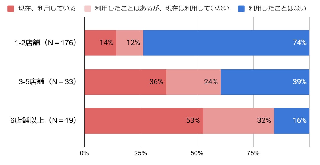 一方、スポットワークの利用状況については、店舗規模によって大きく差がある結果となり、2店舗以下の小規模企業の74%は利用経験がないと回答しました。