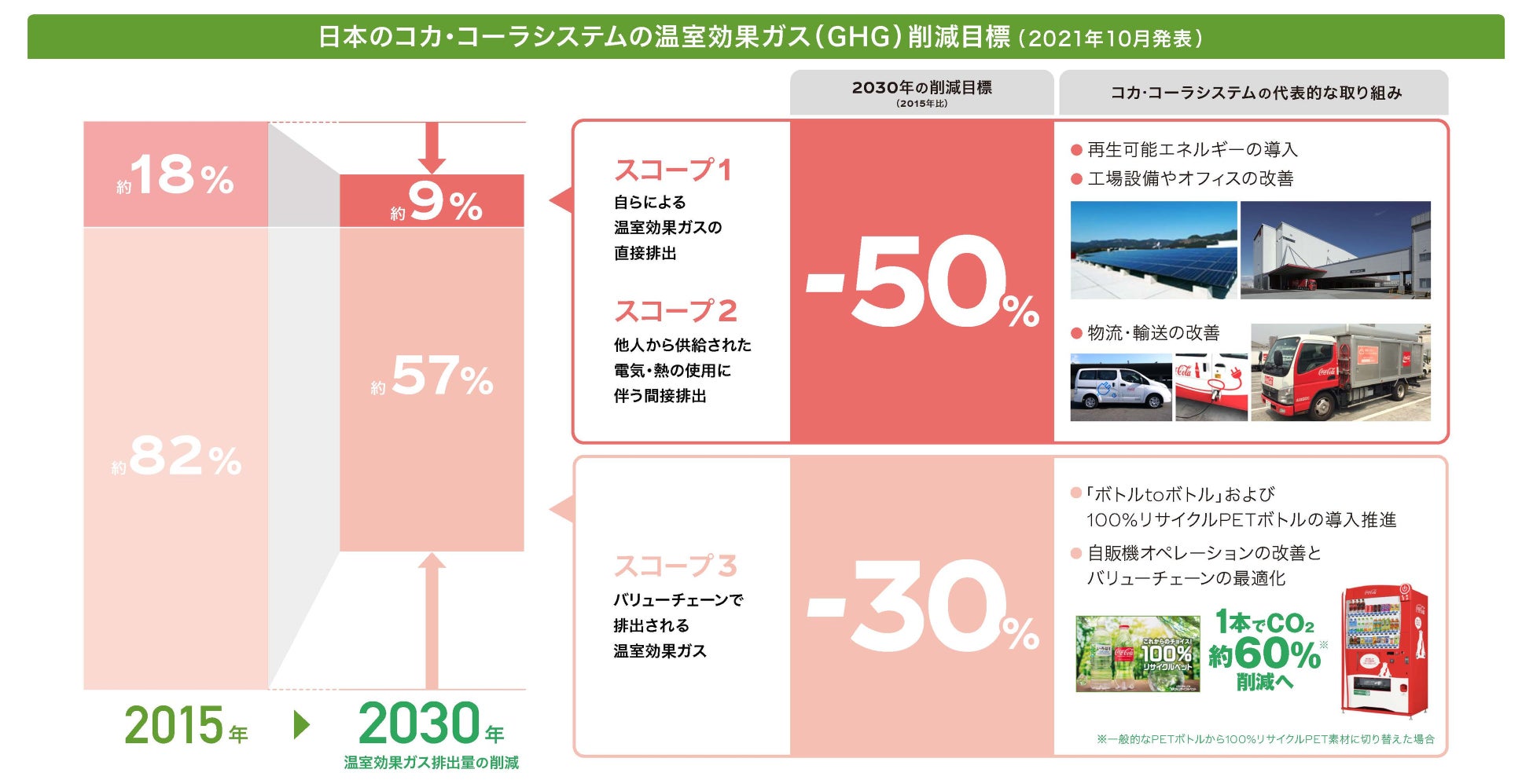 日本のコカ・コーラシステムは、2021年、日本国内のバリューチェーン全体における温室効果ガス(以下GHG)を2030年までにスコープ1、2において50%、スコープ3において30%(いずれも2015年比)削減することを目指す目標を策定し、その達成に向けた取り組みを継続しています。今後もサプライヤー、パートナー企業との連携により、スコープ1、2、3それぞれの領域においてGHG排出量の削減に取り組んでまいります。