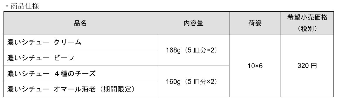 「濃いシチュー クリーム」「濃いシチュー ビーフ」「濃いシチュー 4種のチーズ」8月14日 リフレッシュ・再発売「濃いシチュー オマール海老」(期間限定)9月25日 新発売