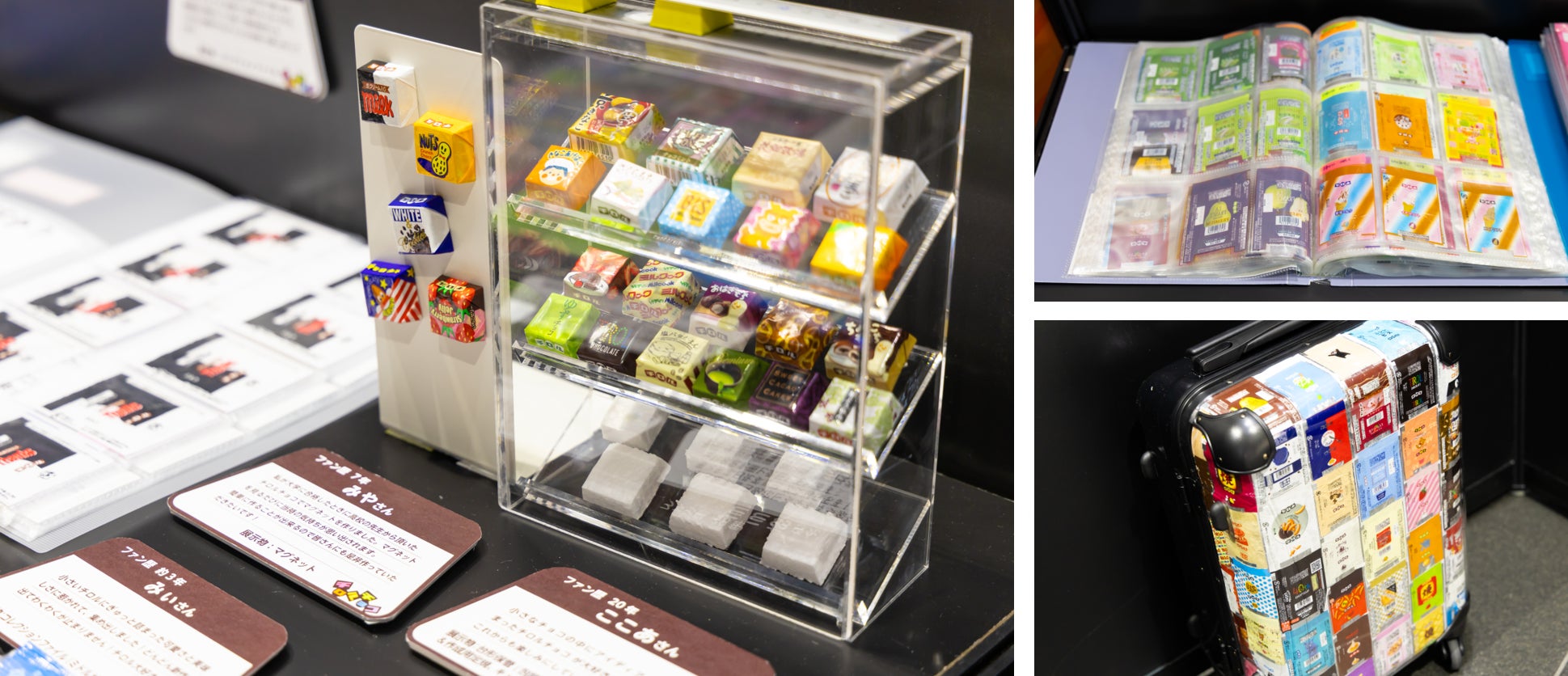 チロルチョコの 大ファンである“チロリスト(TIROLIST)”達が集めた包装紙のコレクションファイルやオリジナル作品をお借りし、展示しました。マグネットや発泡スチロールに包装紙を巻きつけて保管している方や、包装紙をアレンジして作った世界に一つのオリジナルキャリーケースを作っている方も!