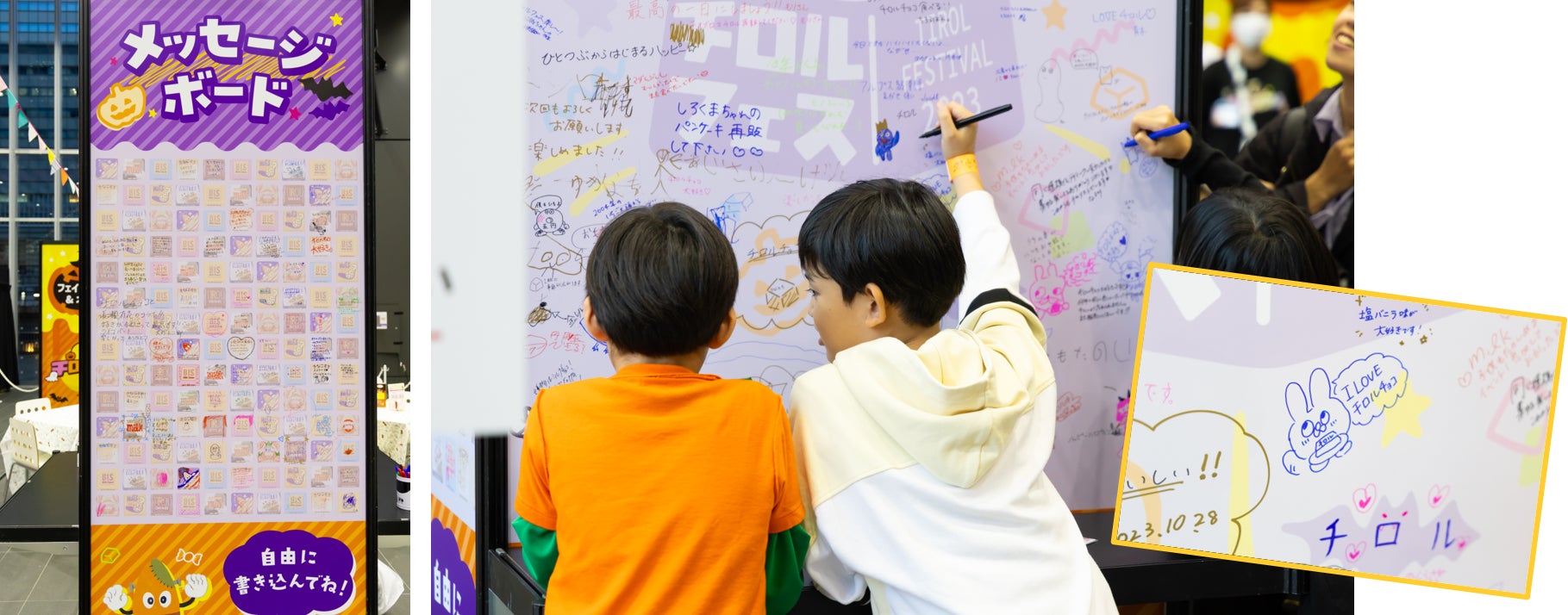 巨大なメッセージボードには、お客様からの嬉しいコメントや可愛いイラストがぎっしり♪