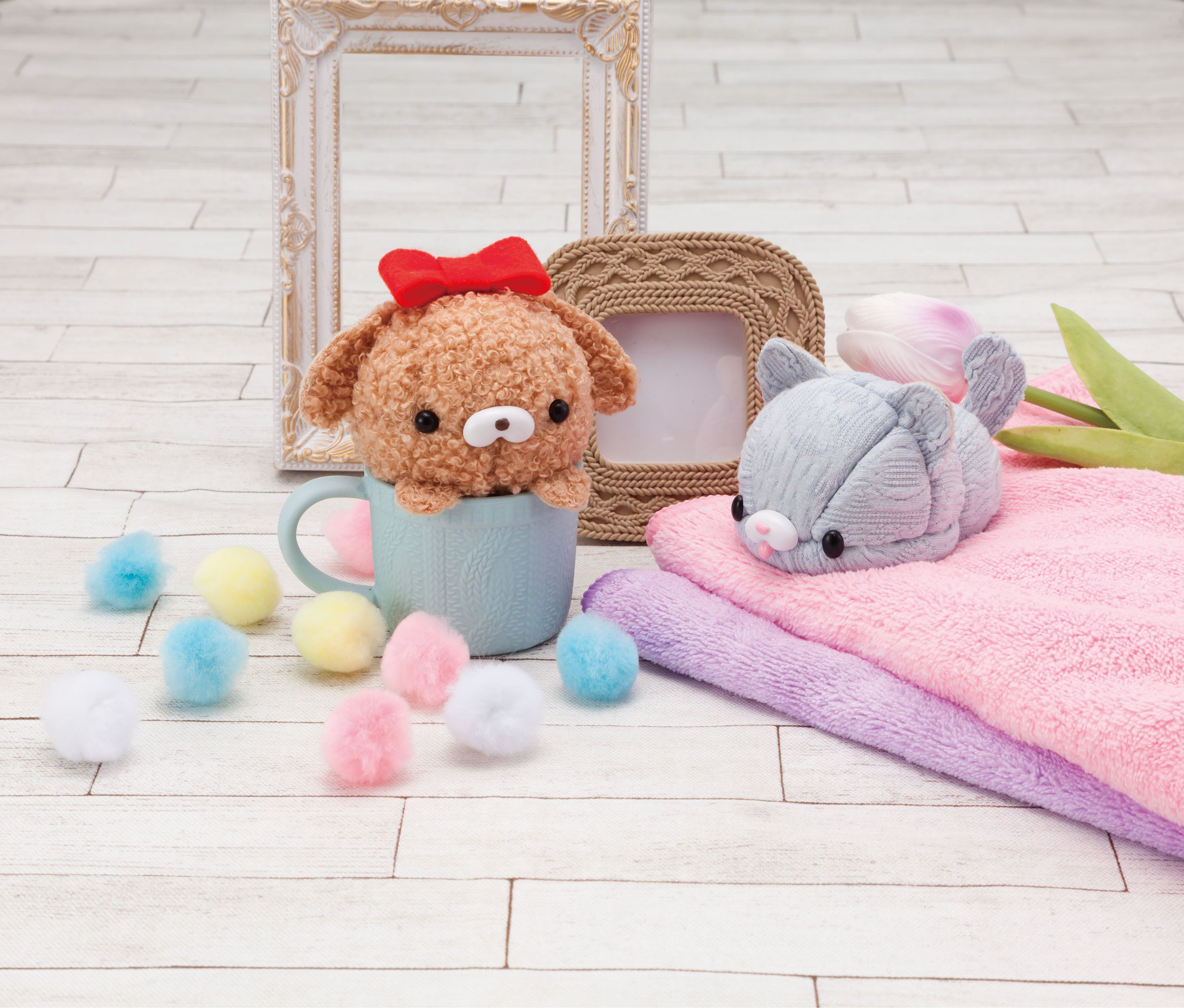 くるまーるは、付属の布やフェルトを本体にスティックで押し込み、目や鼻のパーツをさしたら可愛いマスコットが簡単に出来上がります。材料は市販の布やフェルト、ご家庭にある布も代用が可能です。また、針と糸を使わずに安全に何度でも繰り返し遊ぶことができます。