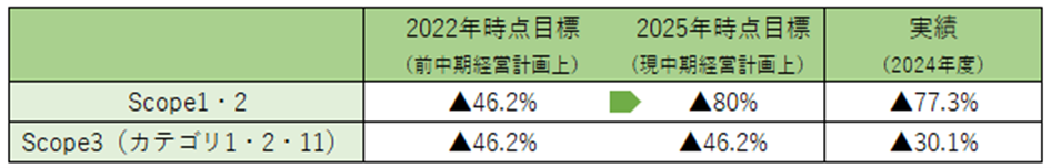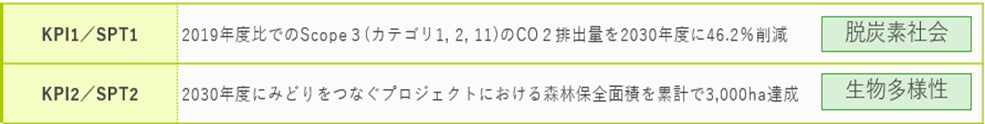 KPI ・KPI1:「Scope3(カテゴリ1,2,11) のCO2排出量削減率」 ・KPI2:「みどりをつなぐプロジェクトにおける森林保全面積累計」 SPT ・SPT1:2019年度比でのScope3(カテゴリ1,2,11)のCO2排出量を2030年度に46.2%削減 ・SPT2:2030年度にみどりをつなぐプロジェクトにおける森林保全面積を累計で3,000ha達成 |