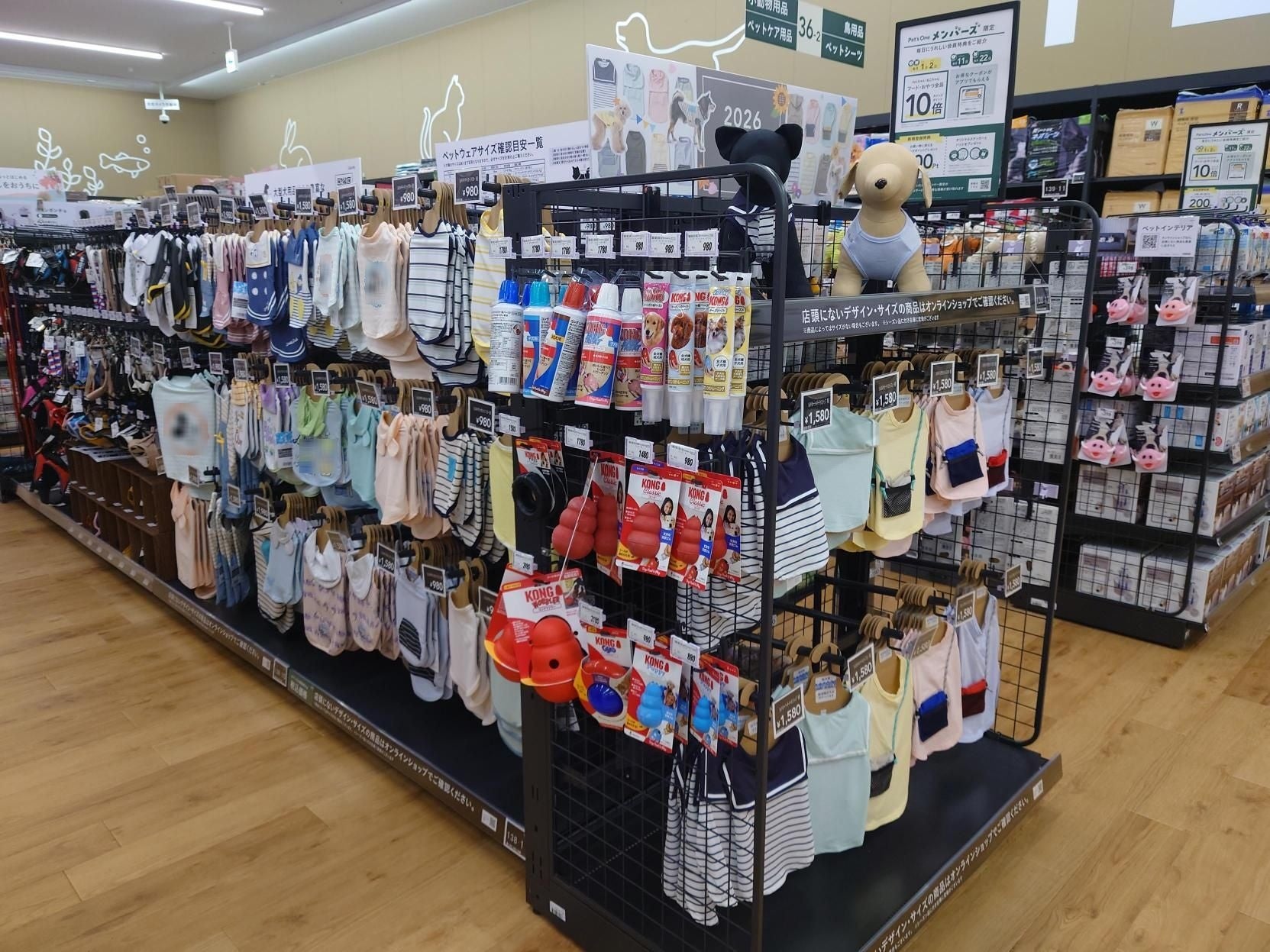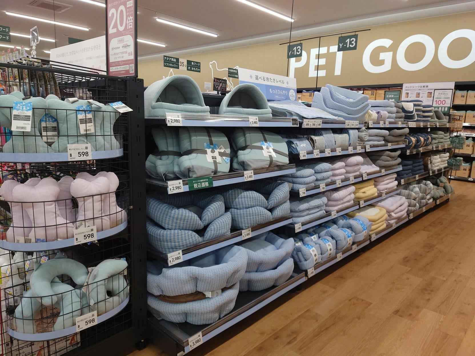 ペット用品売り場では、フードや消耗品をはじめ、毎日のくらしに欠かせない商品を種類豊富に取り揃えています。これからの時期、快適に過ごせるひんやりペットベットや、お出かけに最適なペットウエアなど、ペットとのくらしをより楽しく、快適に過ごせるよう豊富なオリジナル商品を多数取り揃えています。
