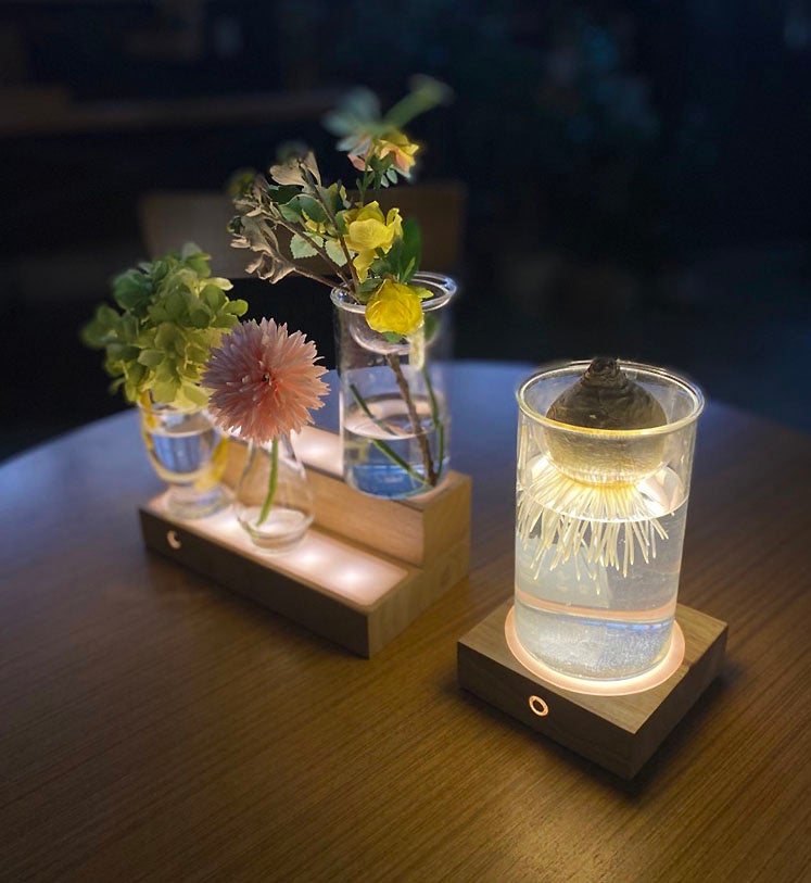 ガラスなどの透明なものは、ライトの灯りが透過し美しい雰囲気をつくりだします。花器やハーバリウム、ハンドメイドのレジン作品などコレクションの展示に目を引くアクセントになります。