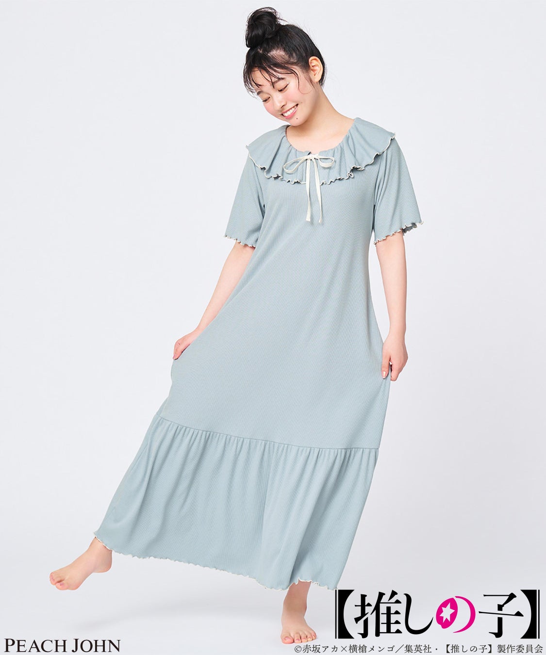 作中のパジャマパーティで「有馬かな」が着ていたルームワンピースをイメージしたルームウェア。ベースカラーは作中のワンピースをイメージした、落ち着いたブルーグレー。中央のリボンと、襟のメロウ始末はサイリウムカラーのホワイトで仕上げました。フリルやリボンなどガーリーなディテールを加えたデザインがポイント。適度に厚みのあるポリエステルレーヨンのストレッチリブ生地で、ボディラインを拾いすぎずにすとんと落ちるシルエットです。