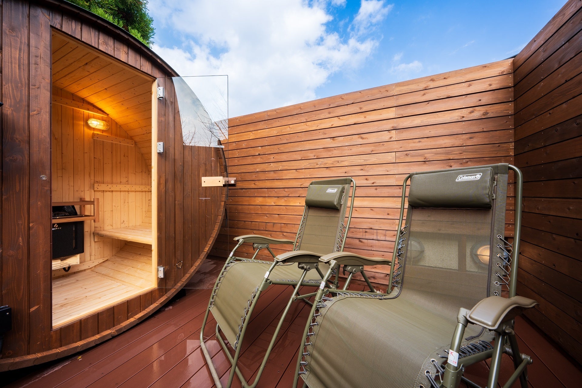 この度、当館屋上にオープンするサウナはバレルタイプのフィンランドサウナ全2棟(定員4名/1棟)で、貸切にてご利用いただけます。テラスには水風呂やチェアも完備しており、星空を眺めながらの“ととのい”を体験いただけます。