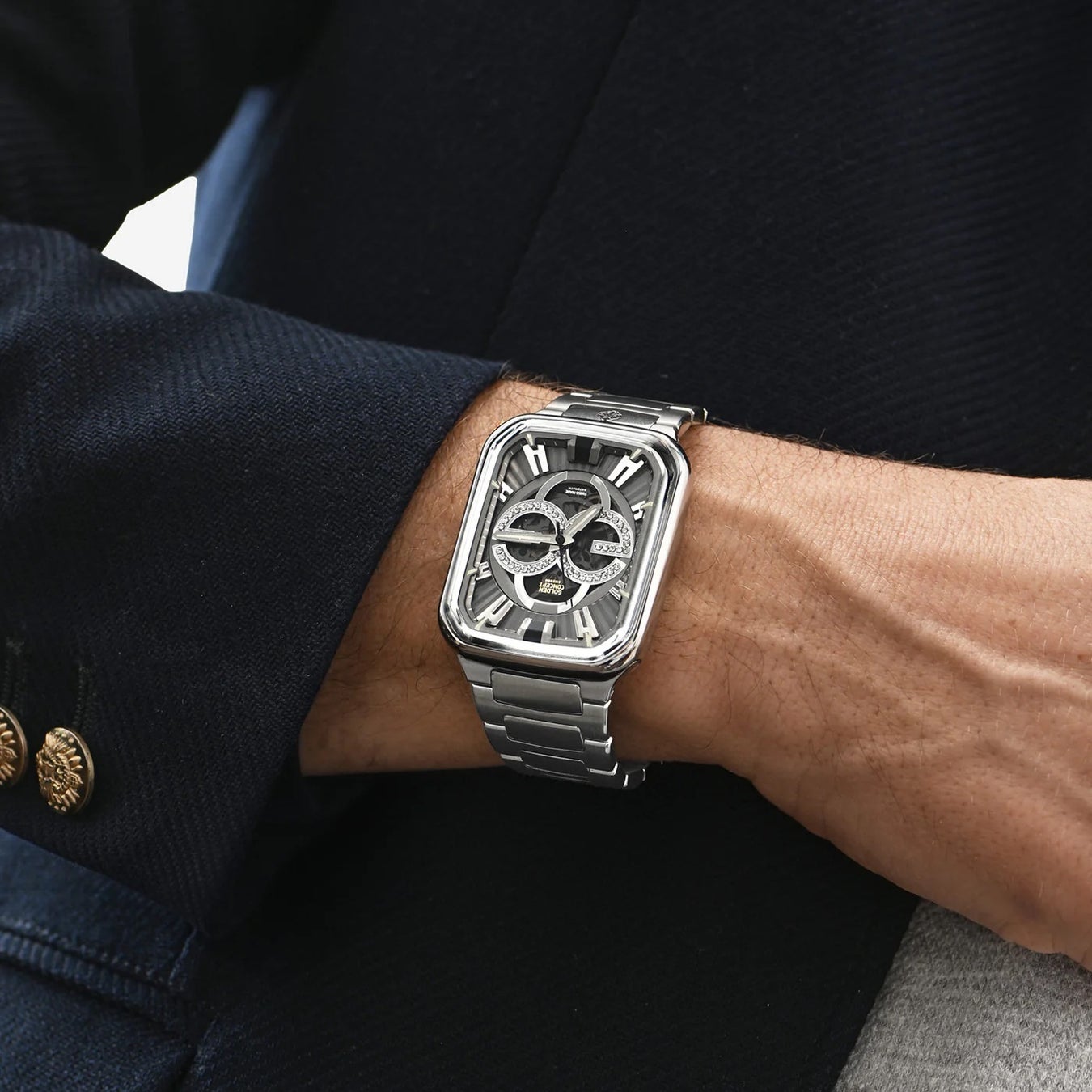 自動巻き機構と38時間のパワーリザーブを搭載しており、身に着けている間、常に動き続けることができます。日常的に使用すれば、時計は止まることなく、正確に時を刻み続けます。また、万が一着けていない時間があったとしても、パワーリザーブが38時間あるため、しばらく放置しても時刻を正しく表示し続けます。