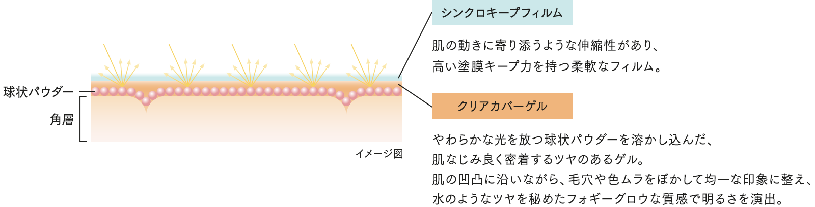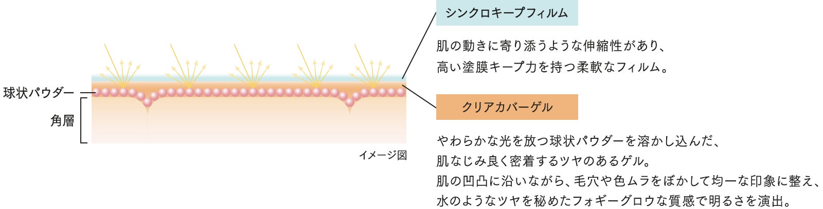 カバー素材を肌になじませ密着させるクリアカバーゲルと、伸縮性のあるしなやかなシンクロキープフィルムを組み合わせた処方。均一にカバーしながらフォギーグロウな質感に整え、明るく清らかな印象を演出。
