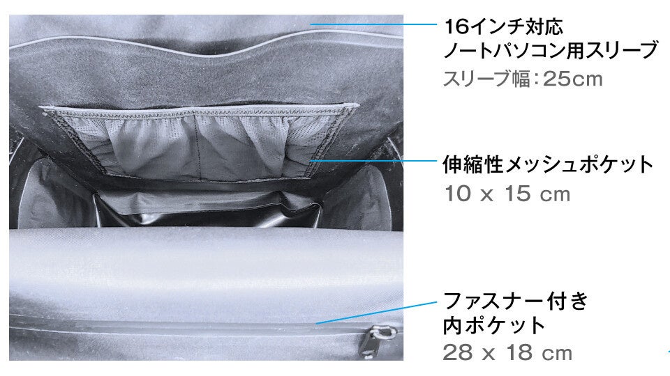 ・両サイドに伸縮性メッシュポケット(直径7.5cmのボトルに最適)