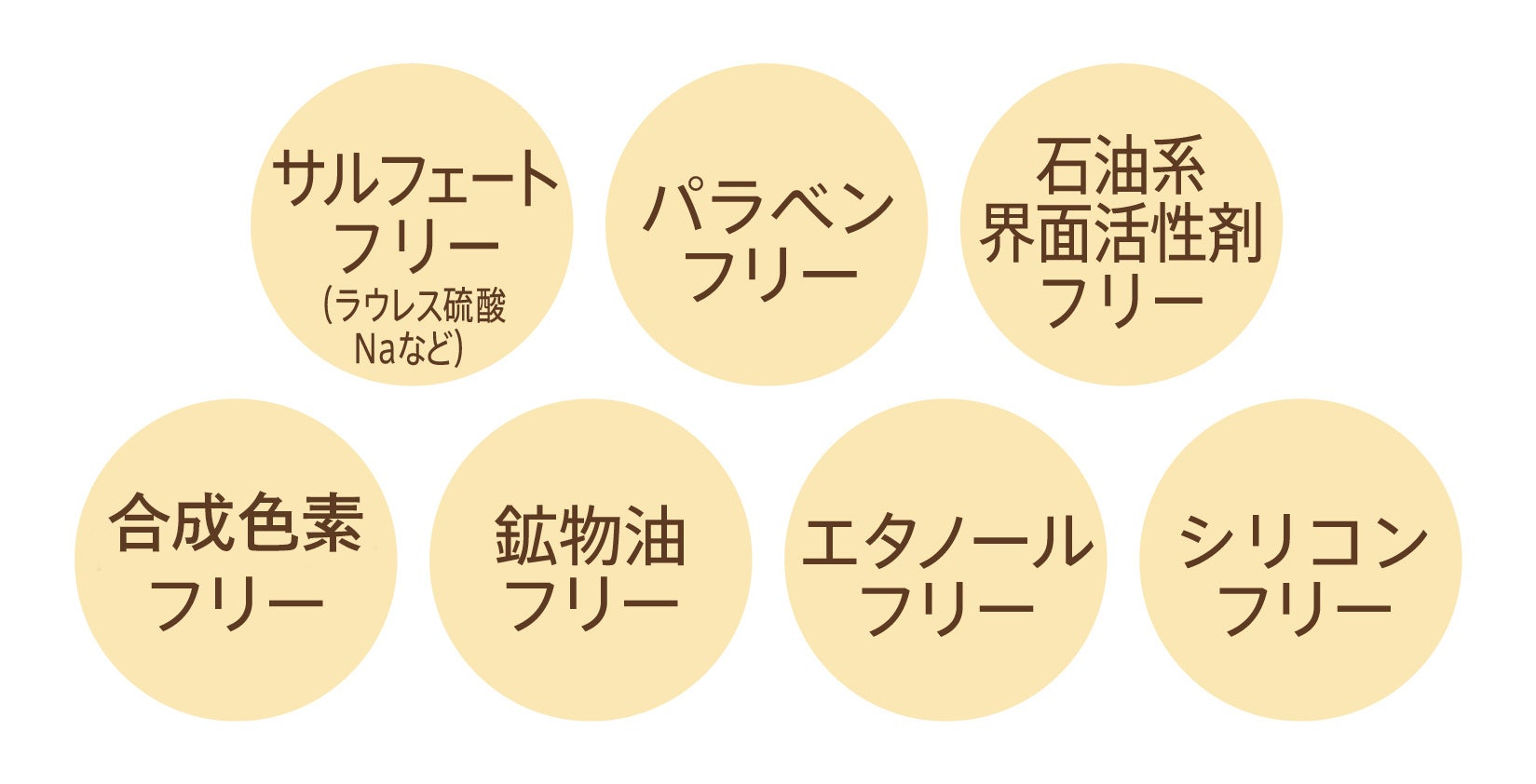 ※1 サルフェートフリー(ラウレス硫酸Naなど)、パラベンフリー、合成色素フリー、鉱物油フリー、石油系界面活性剤フリー、エタノールフリー、シリコンフリー