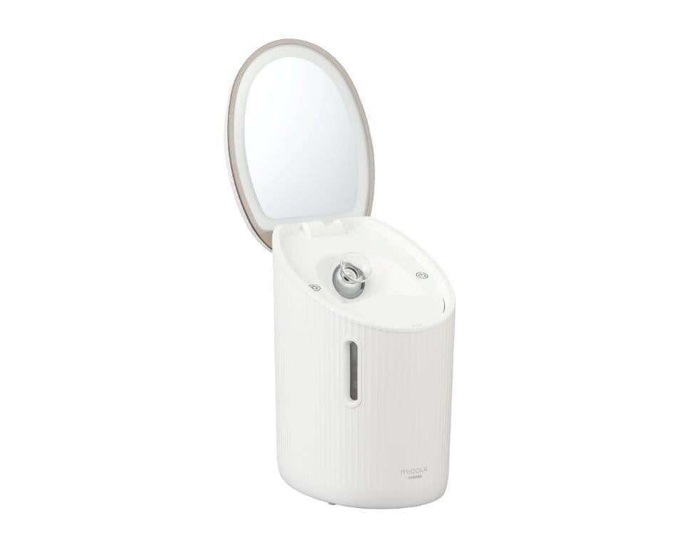 蓋の内側にミラーを搭載しているため、肌状態をミラーで確認しながらケアができます。また、LEDライトは3種類の色(昼光色、昼白色、電球色)に調整できるため、予定に合わせたメイクも楽しめます。更に、デスクに置いたまま使用することを想定し、場所をとらずインテリアにも馴染むようコンパクトかつ可愛らしいプリーツデザインになっています。