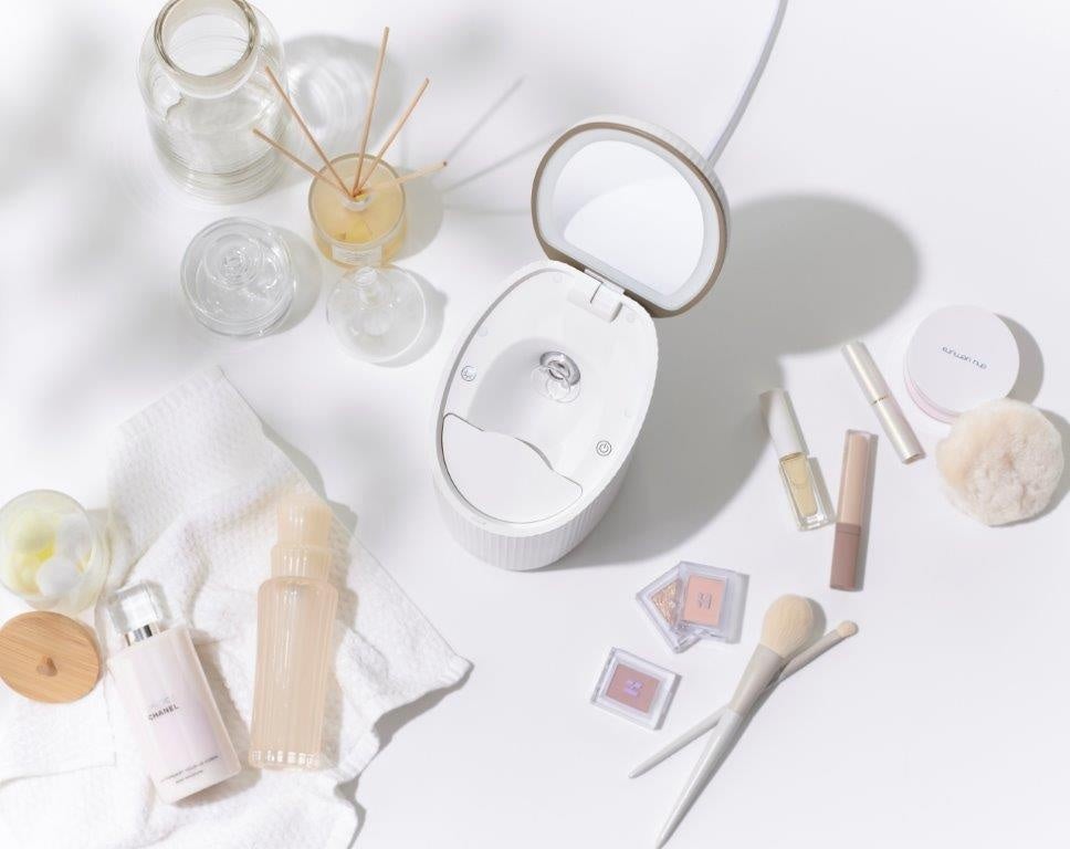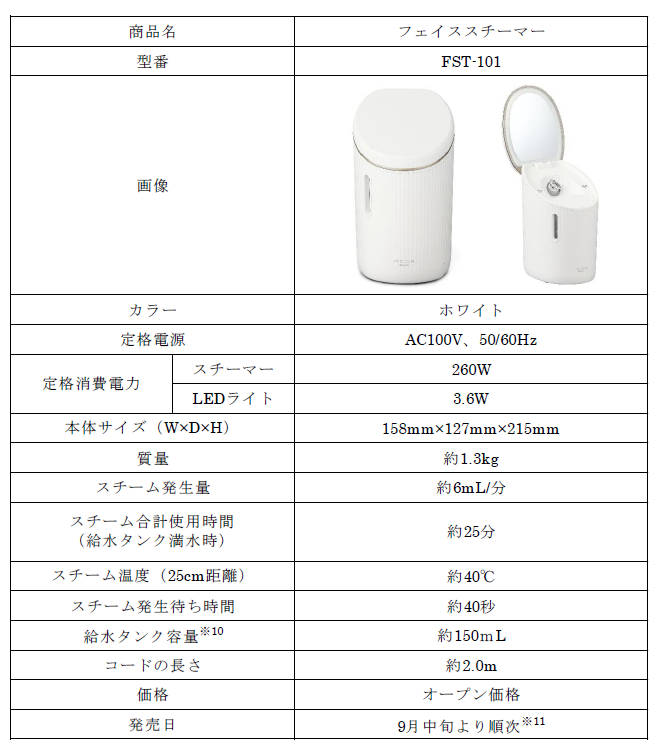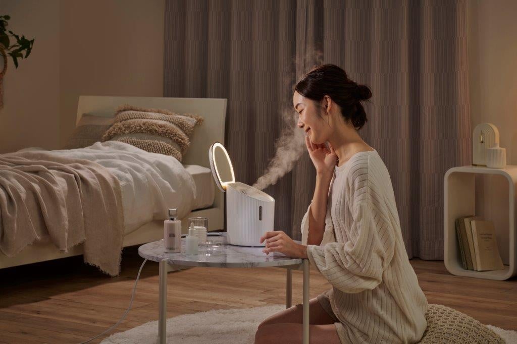 今回の新商品は、忙しい毎日でも気軽に肌と心のケアができる「ご自愛ケア」をコンセプトにしています。約40秒で立ち上がる3種類の温スチームモード(モイスト、クレンジング、メイクアップ)を搭載(※1)し、黒ずみ毛穴の減少(※2)など様々な効果を期待できます。メイクアップにも活用できるLEDライト付きミラーを搭載したほか、コンパクトかつ立体感があるプリーツデザインにより、デスクに置いたままでも場所をとらずインテリアにも馴染みます。また、水の補充が面倒というアンケート結果から、一度の給水で夜のクレンジングから朝のメイクアップまで使用できる大容量の給水タンクを採用し、水を補充する頻度を低減しています。本体外側には給水タンク窓目盛りも付いており、残りの使用可能時間を一目で確認することができます。