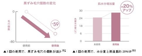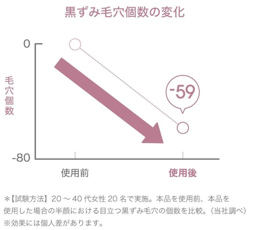 ※2:【試験方法】20~40代女性20名で実施。本品を使用前、本品を使用した場合の半顔における目立つ黒ずみ毛穴の個数を比較。(当社調べ)効果には個人差があります。