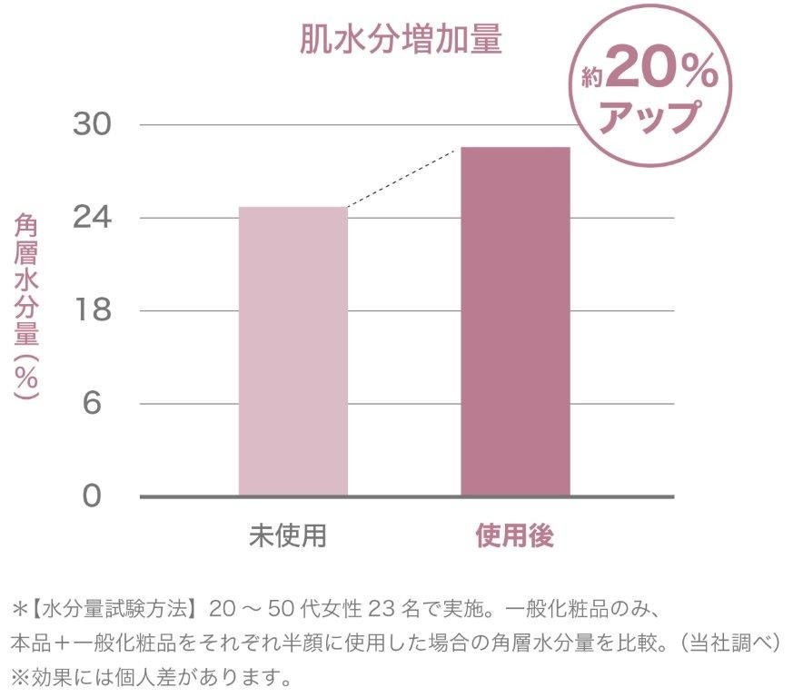 ※8:【水分量試験方法】20~50代女性23名で実施。一般化粧品のみ、本品+一般化粧品をそれぞれ半顔に使用した場合の角層水分量を比較。(当社調べ)【浸透量試験方法】20~40代女性16名で実施。一般化粧品のみ、本品+一般化粧品をそれぞれ前腕に使用した場合の角層浸透量を比較。(当社調べ)効果には個人差があります。