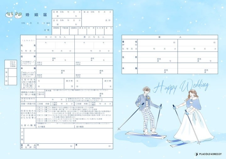第26段となる今回は、人気趣味シリーズやご当地シリーズと共に季節シリーズの全5種を制作、公開致しました。今回のご当地婚姻届は、三重県の「なばなの里」をイメージした婚姻届と岐阜県の「さるぼぼ」を持ったおおふたりのご当地婚姻届を。共通の趣味、そして今の季節楽しむ人も多い「スキー」をモチーフにした婚姻届や編み物好きなお二人にぴったりの「編み物」デザイン、そしてクリスマス婚のおふたりへ季節シリーズの婚姻届も公開しています。