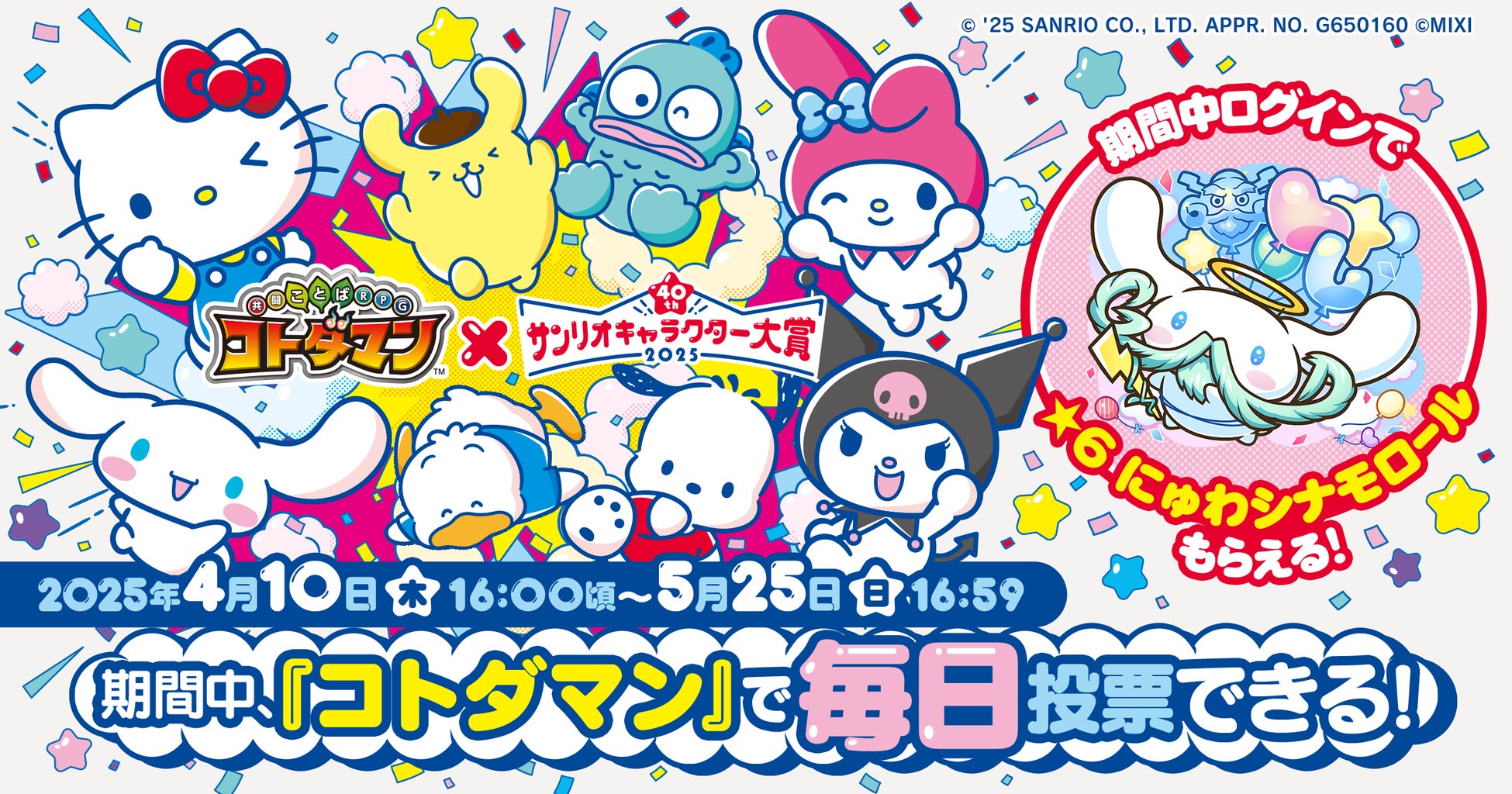 株式会社MIXI(東京都渋谷区、代表取締役社長 上級執行役員 CEO:⽊村 弘毅)は、スマホアプリの「ことば」で闘う新感覚RPG「共闘ことばRPG コトダマン」(以下コトダマン)において、株式会社サンリオの人気投票イベント「2025年サンリオキャラクター大賞」とのコラボを、4月10日(木)16:00頃より開催します。
