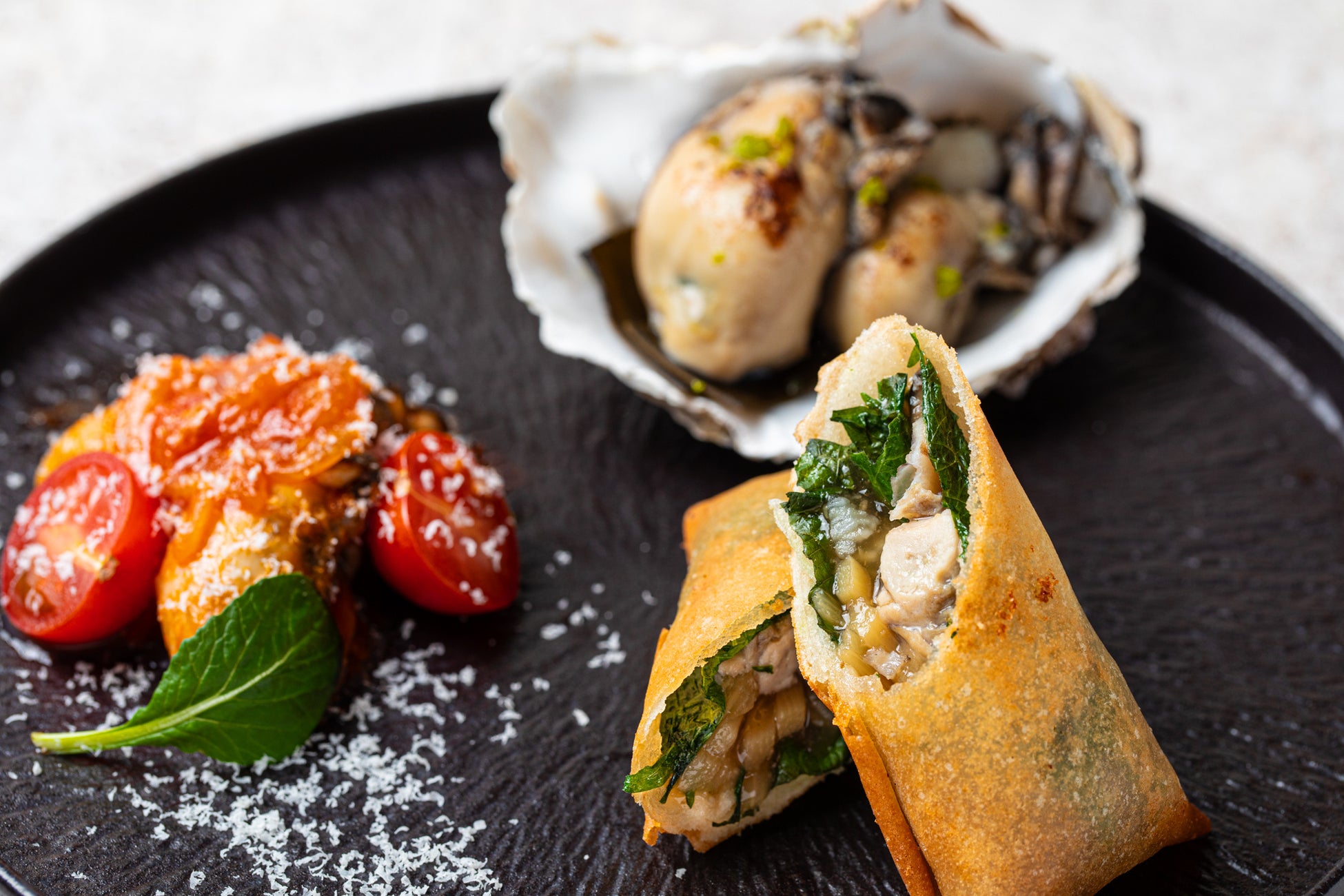 3種の牡蠣タパス盛合せ(牡蠣と竹の子の揚げ春巻き・牡蠣のトマトマリネ・牡蠣の昆布締め)
