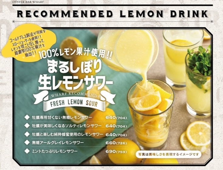 ドリンクメニューでは、牡蠣が「より美味しくなる」「より楽しめる」を追及したレモンカテゴリーを充実させました。なかでも一番のおすすめは『牡蠣専用レモンサワー』是非一度は飲んでいただきたい一品。
