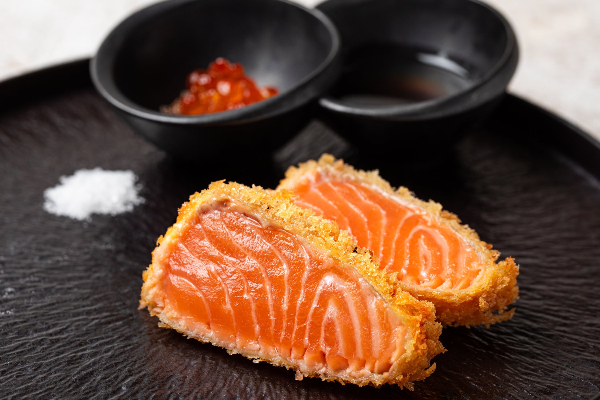 ロゼ色に仕上げたサーモンのレアカツ 2カット