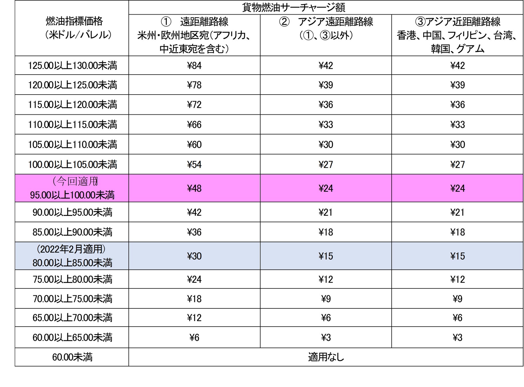 貨物燃油サーチャージテーブル (表示価格は貨物1kgあたり)